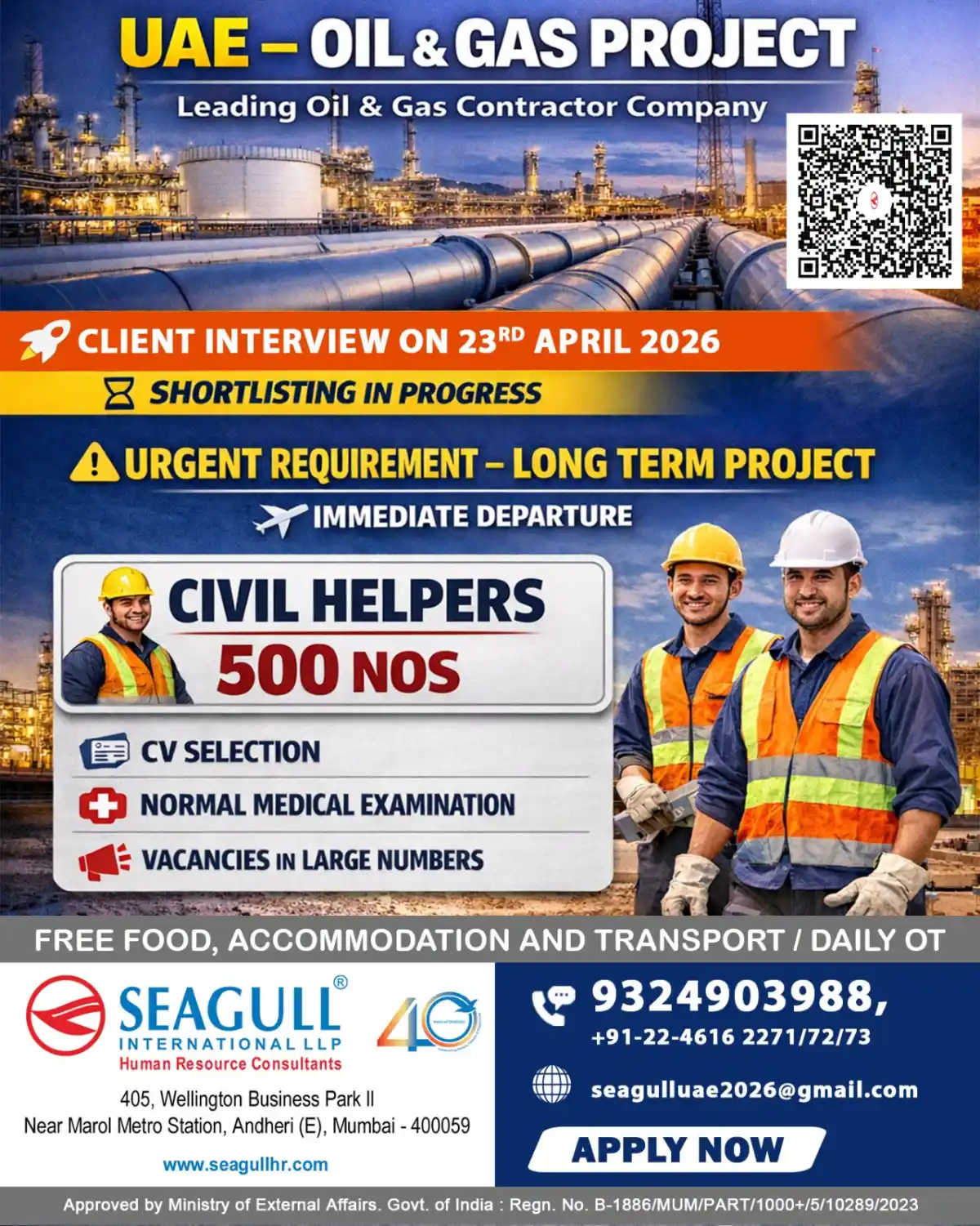 Urgent requirement for 500 Civil Helpers in UAE Oil & Gas project. Immediate departure. Free food, accommodation, transport, and daily OT. Apply now!