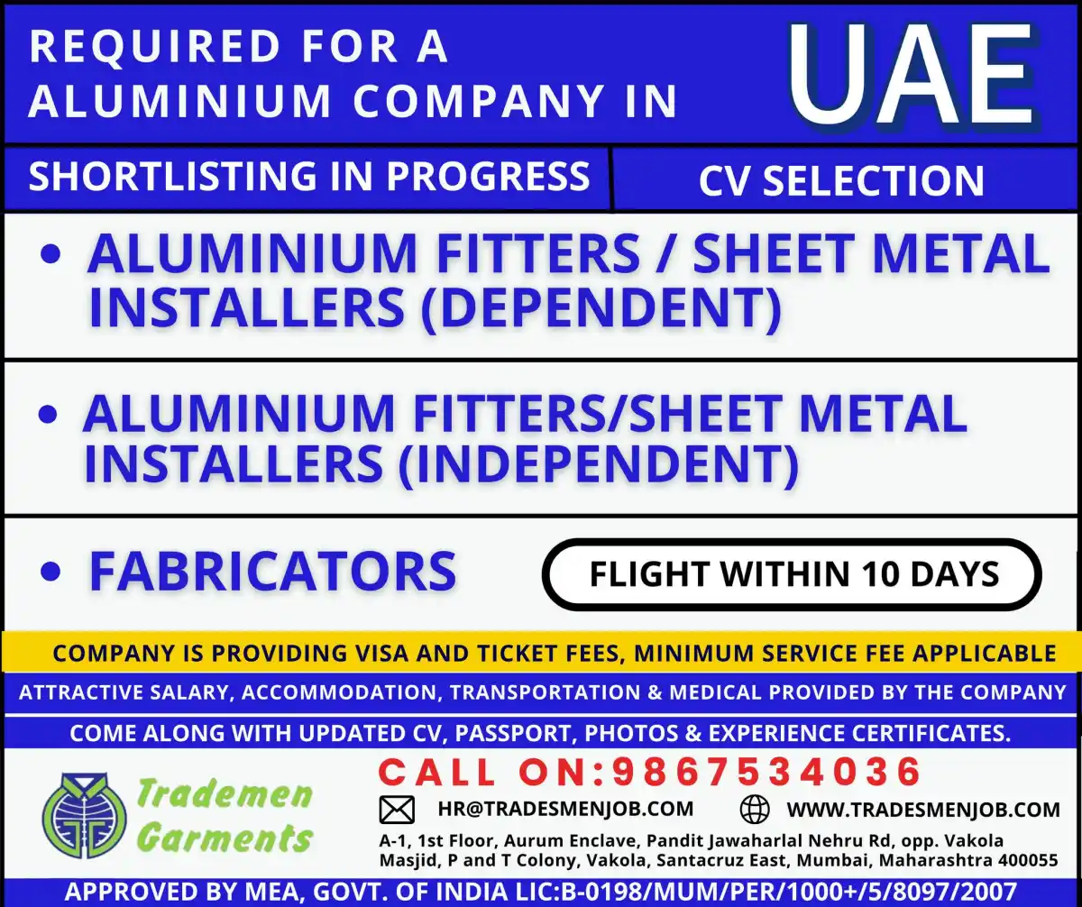Urgent hiring for Aluminium Fitters & Fabricators in UAE. Visa, flight, accommodation provided. Apply now!