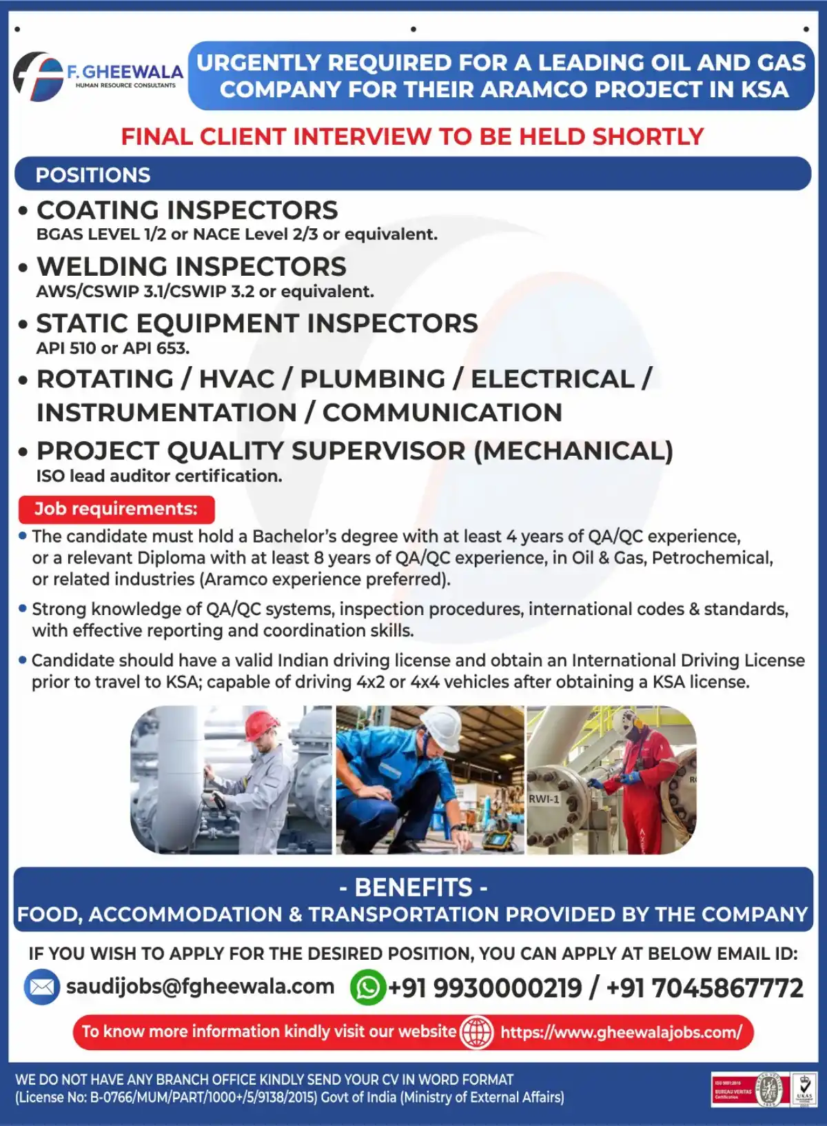 Join a leading Oil & Gas company in KSA for urgent QA/QC inspector roles. Benefits provided. Final interviews soon.