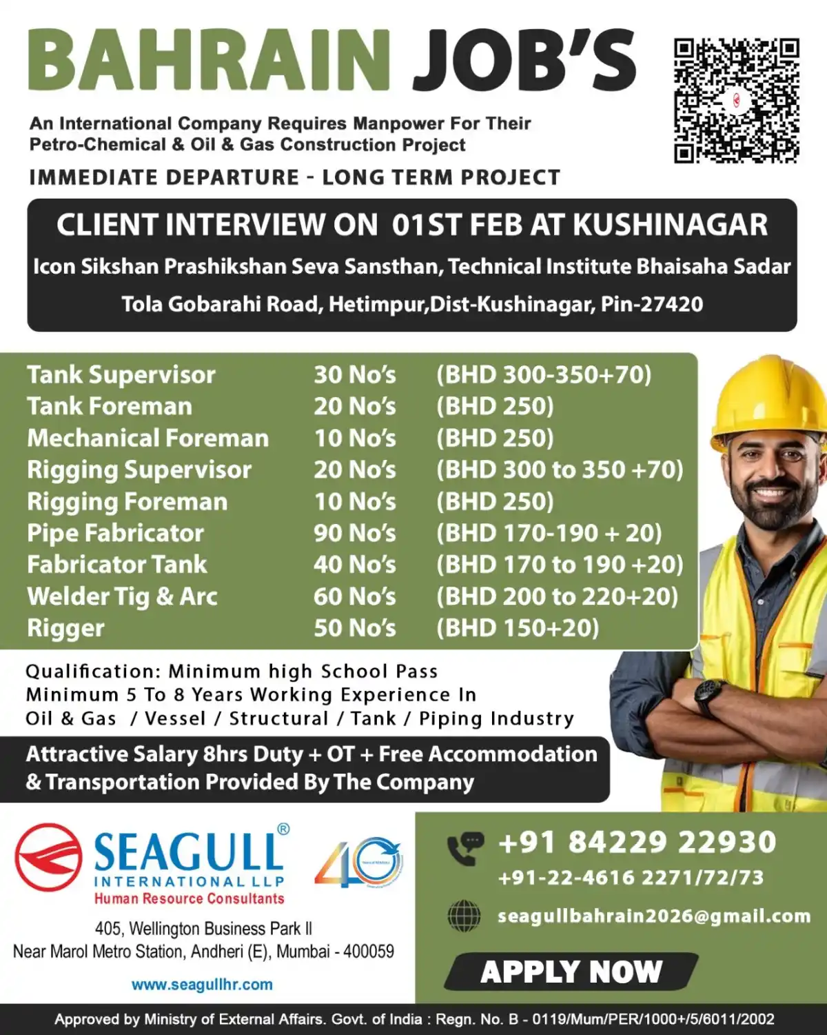 Urgent hiring for Bahrain petrochemical project. Positions: Tank Supervisor, Welder, Pipe Fabricator, Rigger. Salary BHD 150-350 + benefits. Interview 1st Feb Kushinagar. Min 5-8 yrs Oil & Gas exp required.