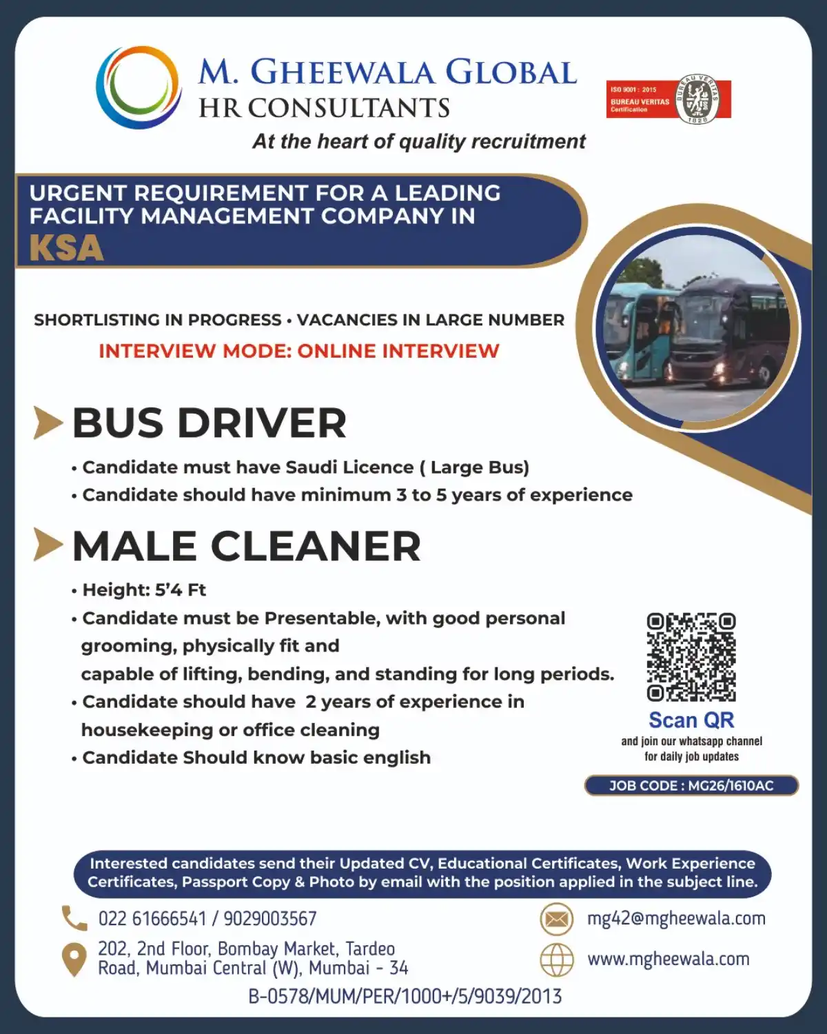 Immediate openings for Bus Driver (Saudi license required) and Male Cleaner positions in Saudi Arabia with leading facility management company. Online interview process. Submit your application now.