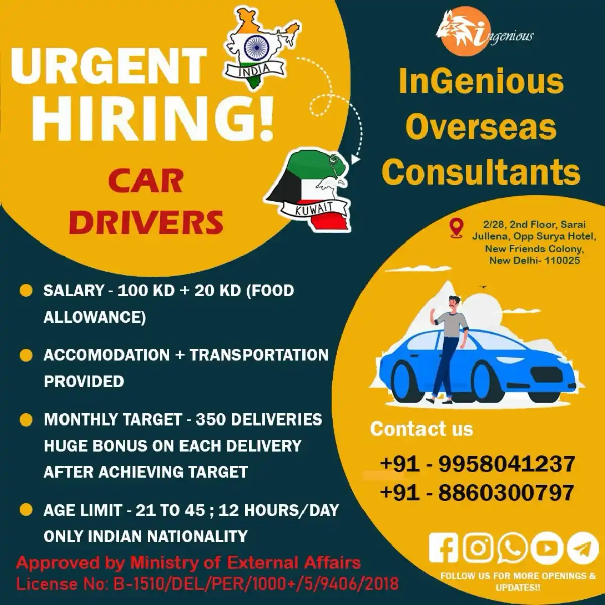 InGenious India urgently recruits Indian Car Drivers for Kuwait. Salary: 100 KD + 20 KD food allowance. Accommodation & transport provided. Age: 21-45 yrs. Contact now!