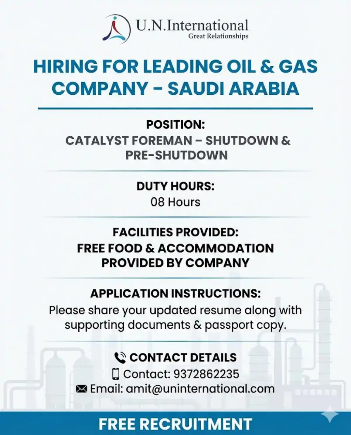 Immediate opening for Catalyst Foreman with shutdown experience in Saudi Oil & Gas sector. Free accommodation and meals provided. Submit resume to amit@uninternational.com