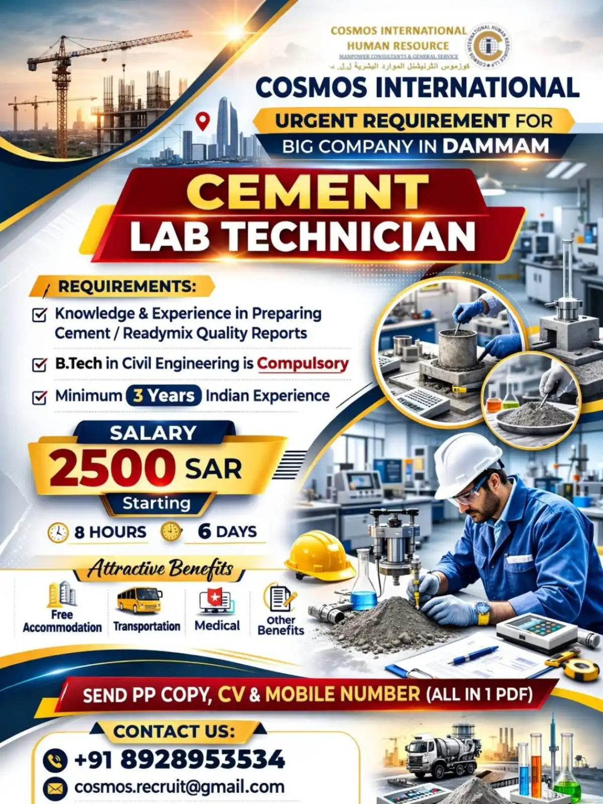 Urgent hiring for Cement Lab Technician in Dammam. Requires B.Tech Civil with 3+ years Indian experience in cement quality reports. Salary 2500 SAR + free accommodation & benefits.