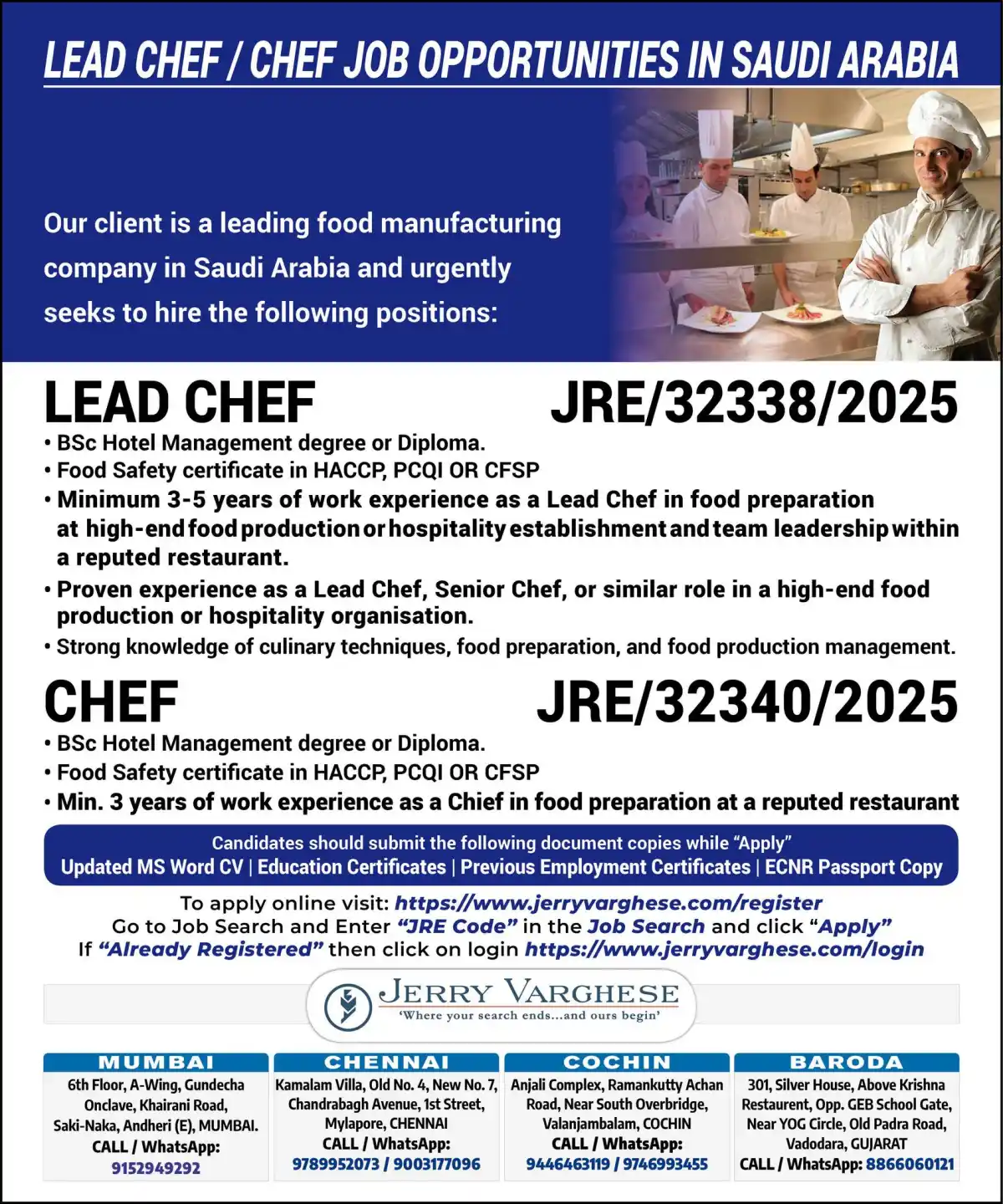 Immediate openings for Lead Chef and Chef in Saudi Arabia. Requires Hotel Management degree, food safety certificates, and 3-5 years experience. Apply via Jerry Varghese with required documents.