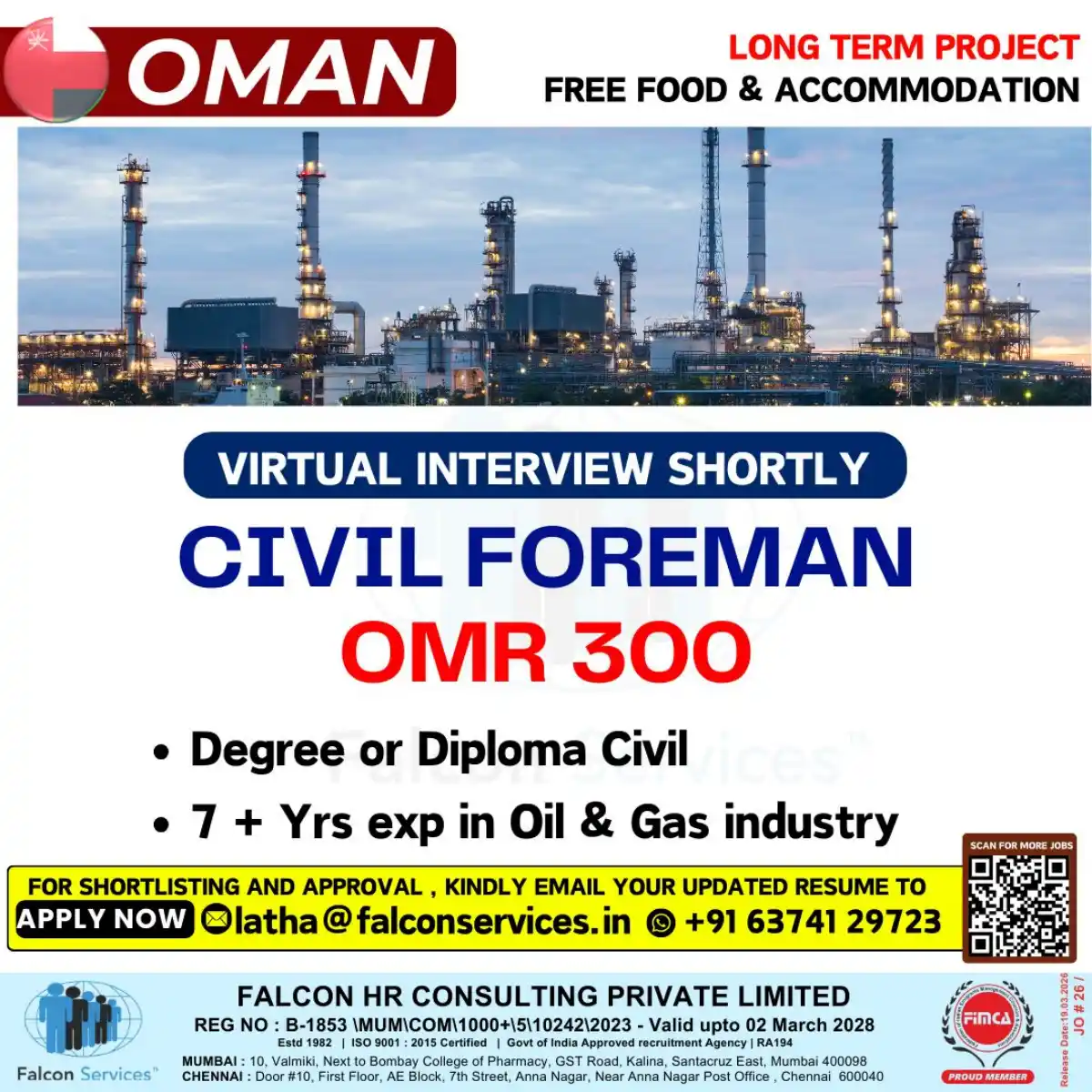 OMR 300 salary + Free Food & Accommodation. Degree/Diploma Civil with 7+ years Oil & Gas experience required. Virtual interview process.