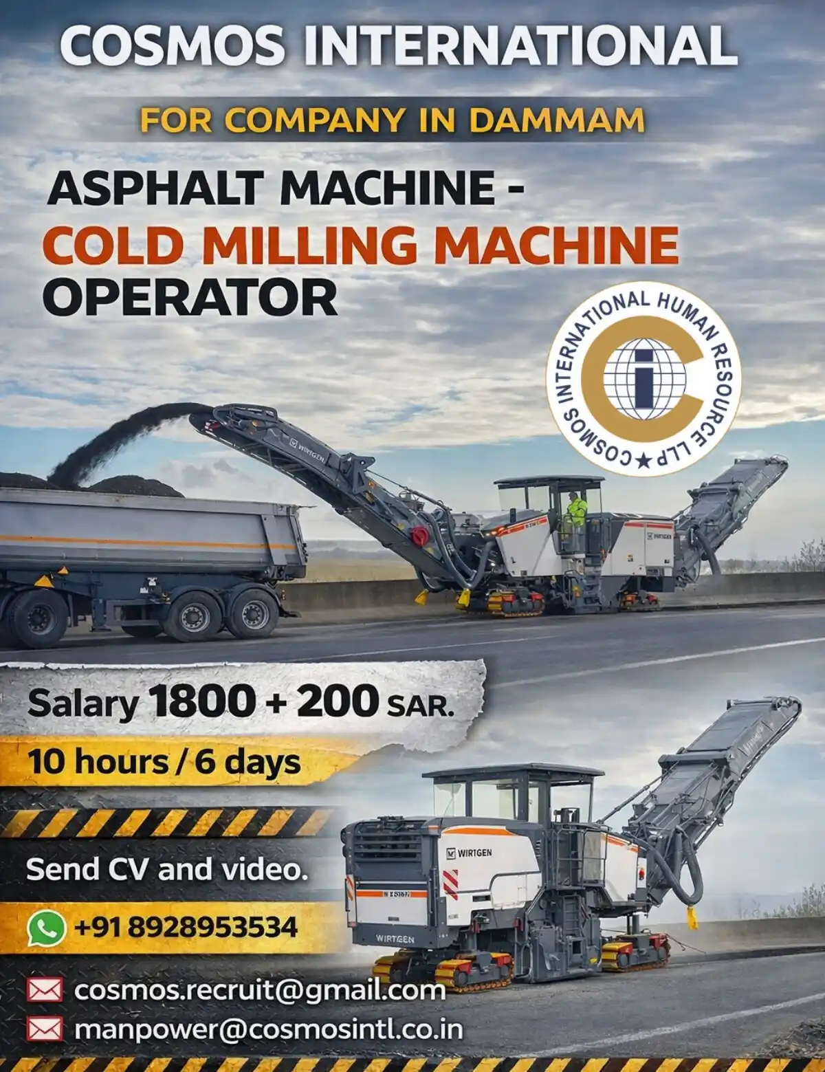 COSMOS INTERNATIONAL is hiring a Cold Milling Machine Operator in Dammam. Salary: 1800+ 200 SAR, 10 hours/6 days. Apply with CV and video to cosmos.recruit@gmail.com or manpower@cosmosintl.co.in.