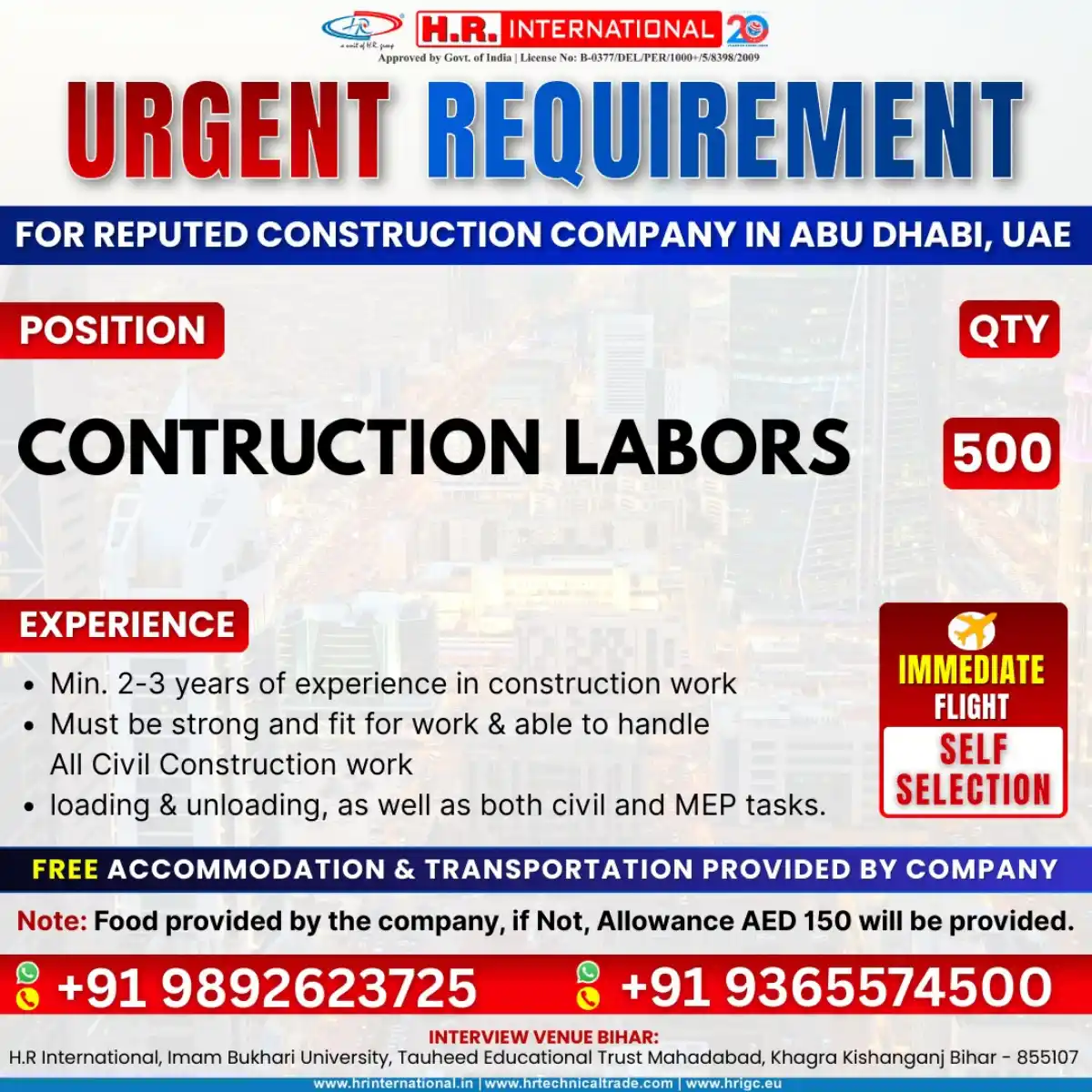 Immediate hiring of 500 Construction Labors for Abu Dhabi. 2-3 years experience required. Free accommodation, transport provided. Walk-in interview at Bihar location.