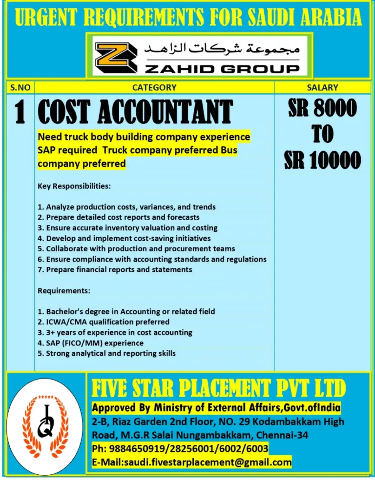 Immediate opening for Cost Accountant at Zahid Group. Requires cost accounting experience, SAP skills, and truck industry background. Salary SR 8000-10000.