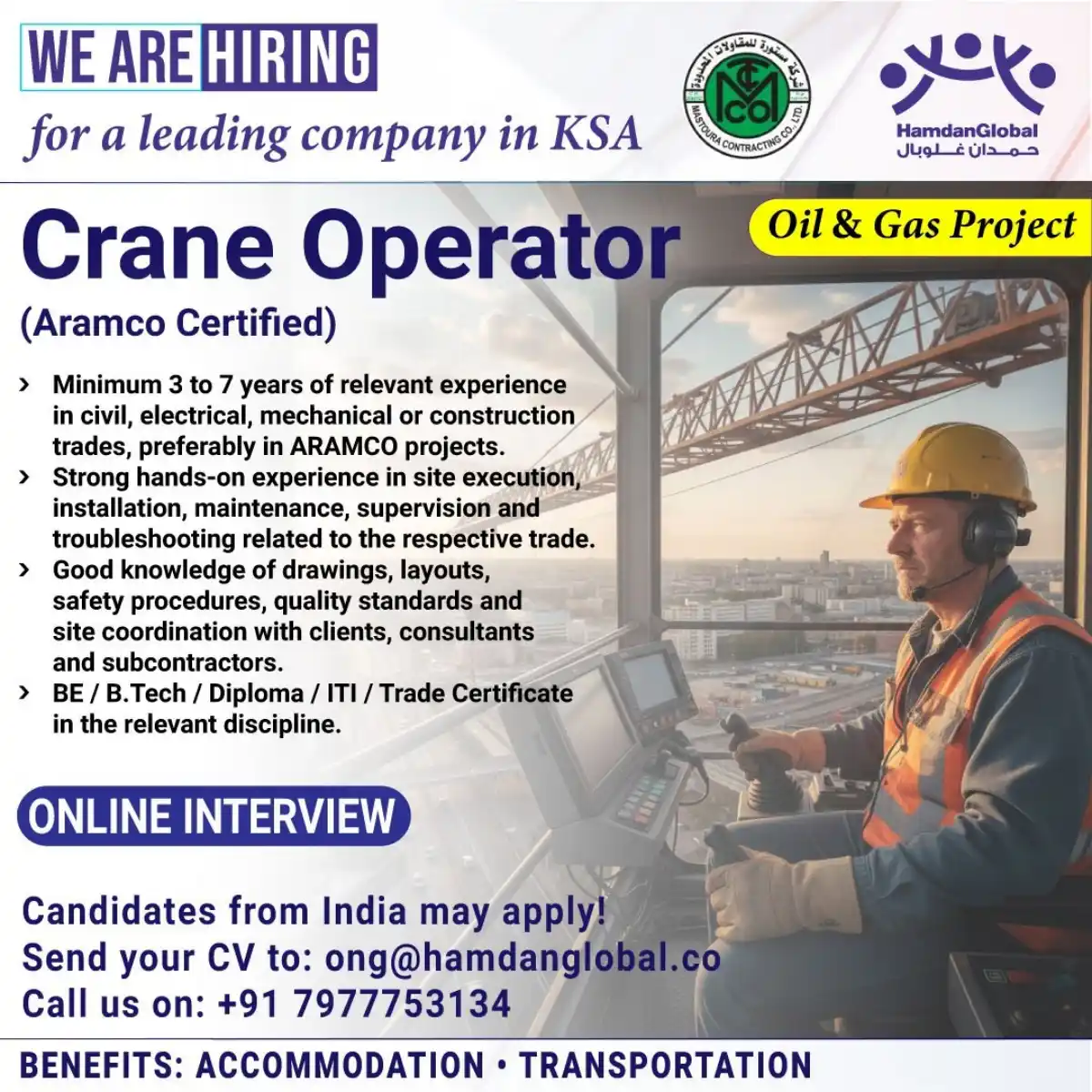 Immediate hiring for Aramco certified Crane Operator in Saudi Arabia. Minimum 3-7 years experience in construction trades. Accommodation & transportation provided. Online interviews.