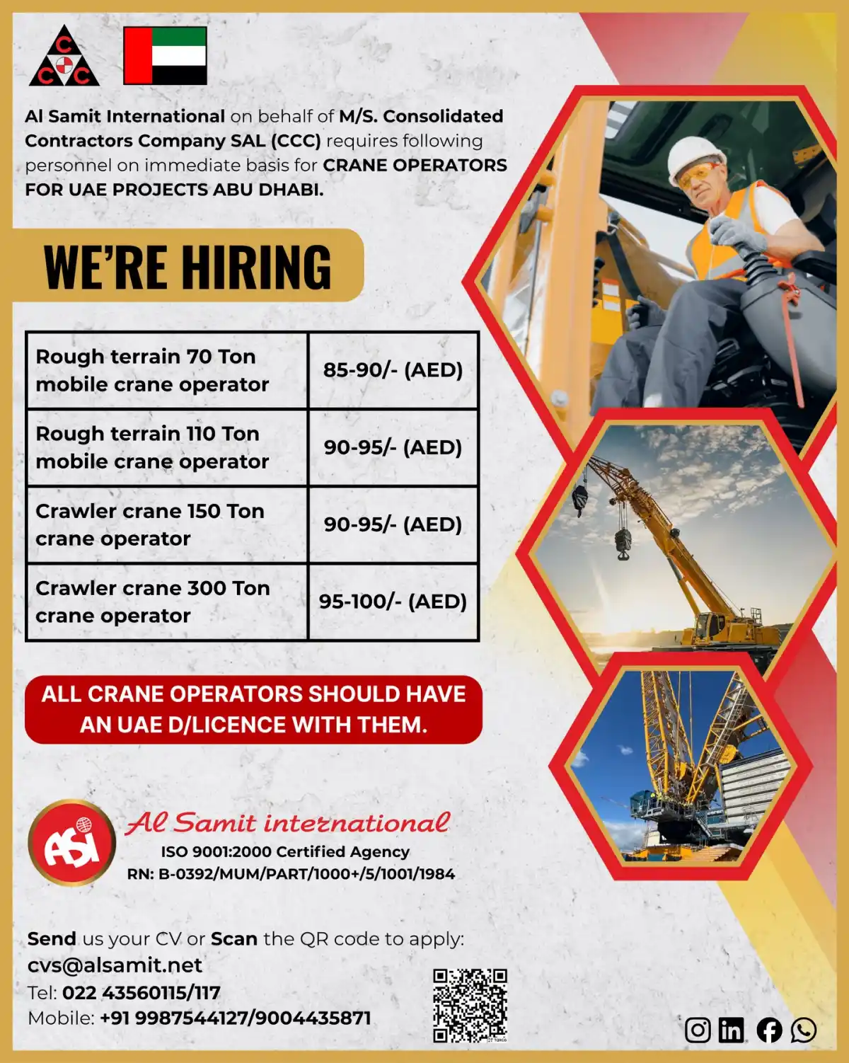 Immediate openings for crane operators in Abu Dhabi with Al Samit International. Positions available for various crane types. UAE driving license mandatory.