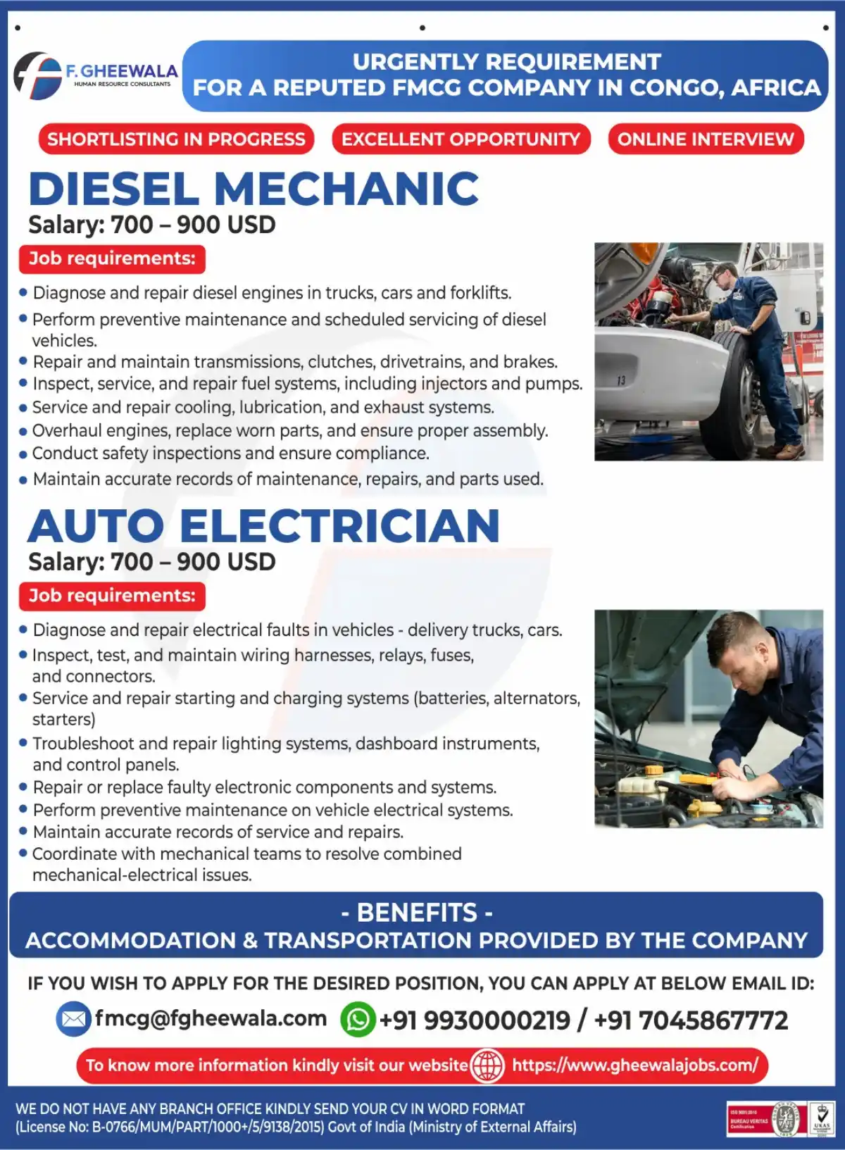 Skilled Diesel Mechanics and Auto Electricians needed urgently in Congo for FMCG company. Salary 700-900 USD, accommodation and transport provided. Apply now via email.