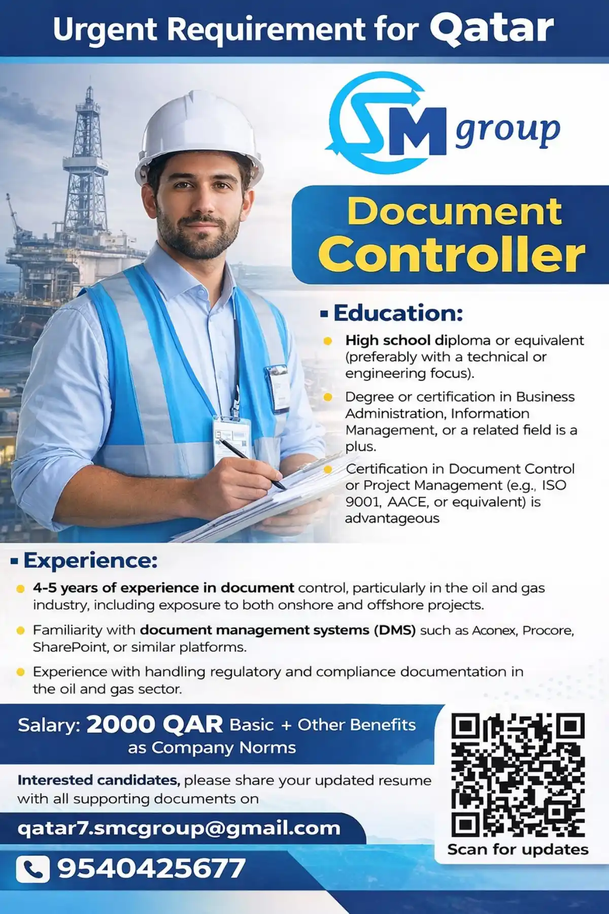 Urgent requirement for a Document Controller at SM Group Qatar. Must have 4-5 years in oil & gas and know DMS systems. Salary: 2000 QAR + benefits. Send your CV to apply.