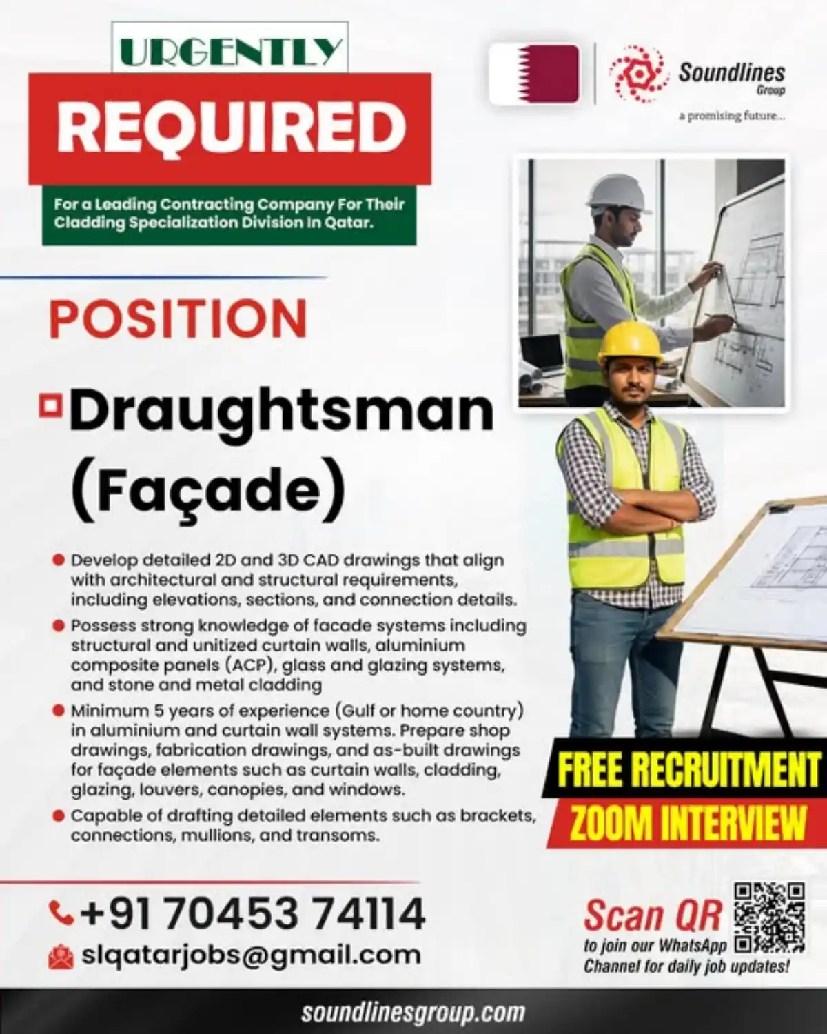 Urgent hiring for Draughtsman (Façade) with 5+ years experience in aluminium & curtain wall systems for a leading contractor in Qatar. Free recruitment & Zoom interview.