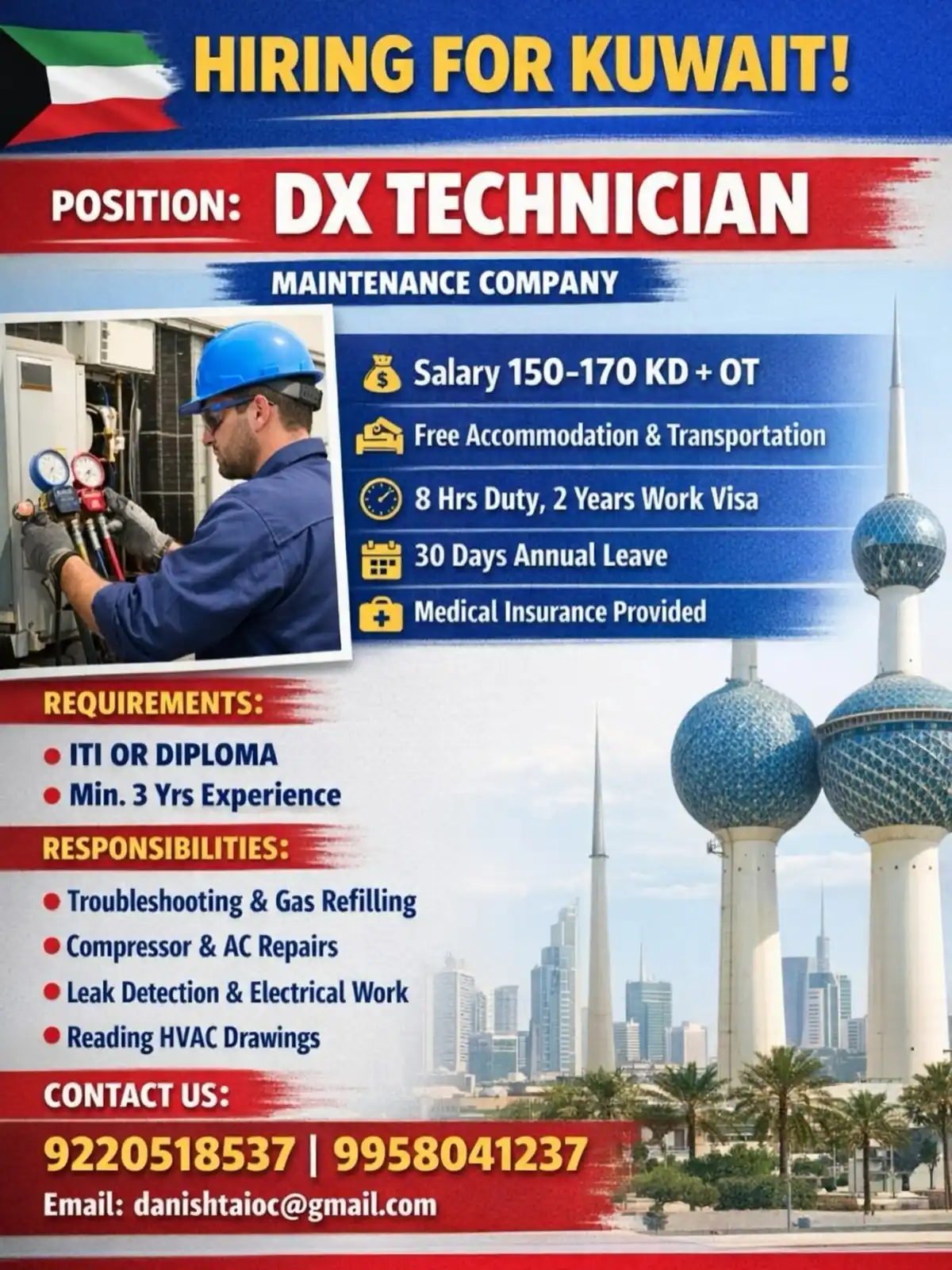 HVAC maintenance company hiring DX Technician in Kuwait. Requirements: ITI/Diploma with 3 years experience. Benefits include 150-170 KD salary, free accommodation, transportation, medical insurance, and annual leave.