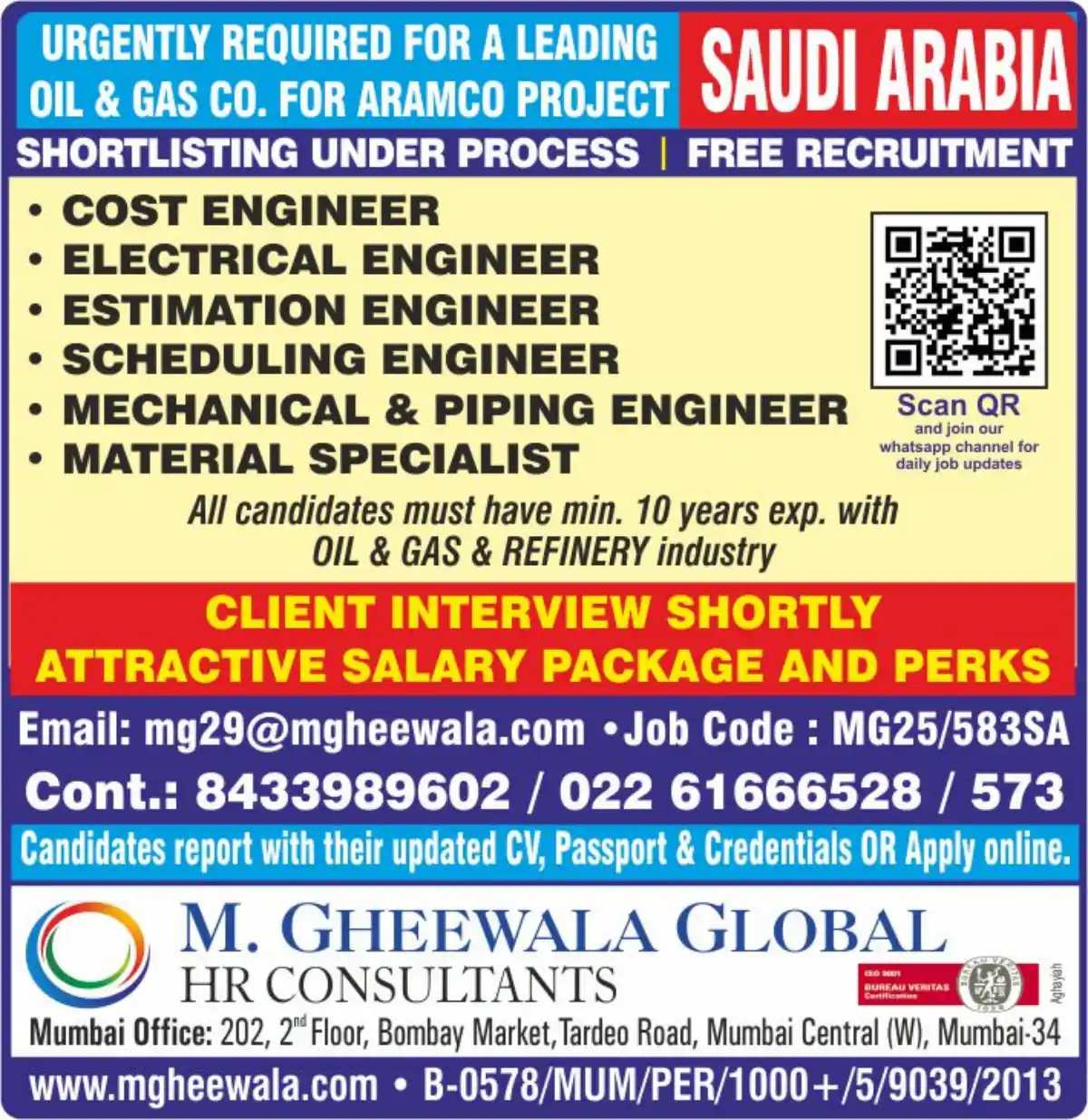 Urgent hiring for Cost Engineer, Electrical Engineer, Estimation Engineer, Scheduling Engineer, Mechanical & Piping Engineer, and Material Specialist positions. Minimum 10 years Oil & Gas experience required. Free recruitment.