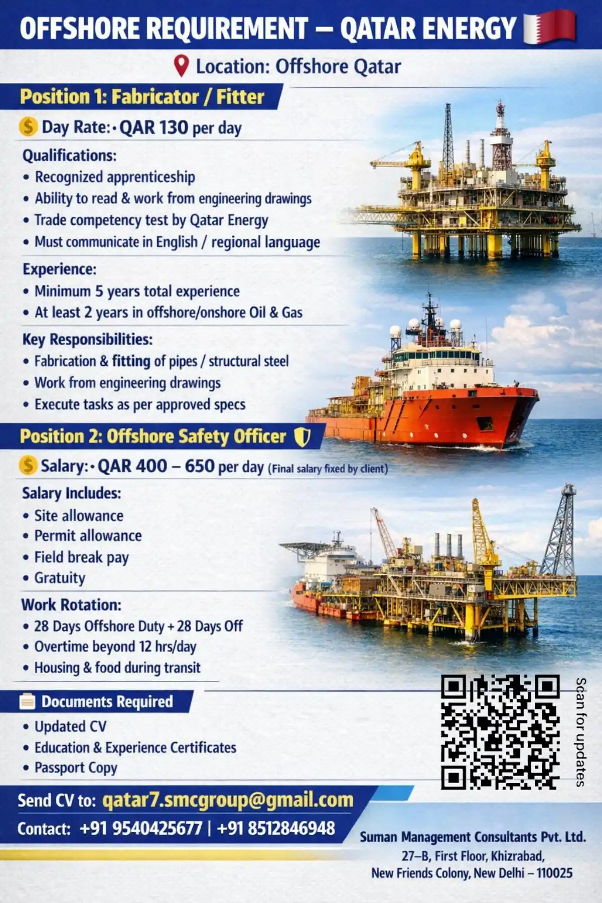 Qatar Energy is looking for experienced Fabricator/Fitter and Offshore Safety Officer for offshore projects in Qatar. Attractive salary and benefits.