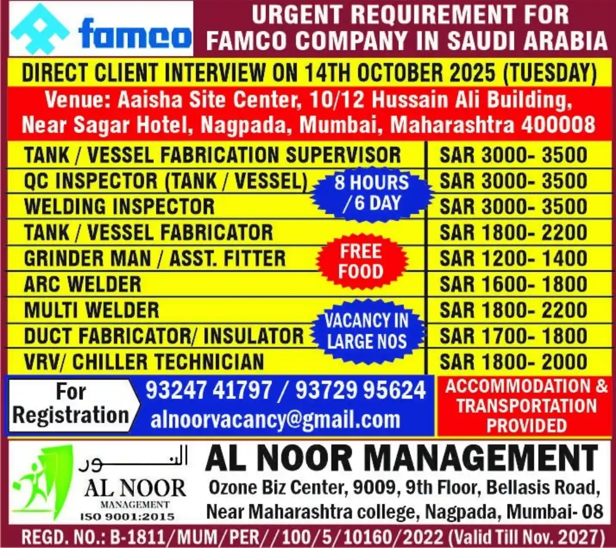 Hiring for multiple roles in Saudi Arabia with direct interviews on 14 Oct 2025. Free accommodation and transport provided.