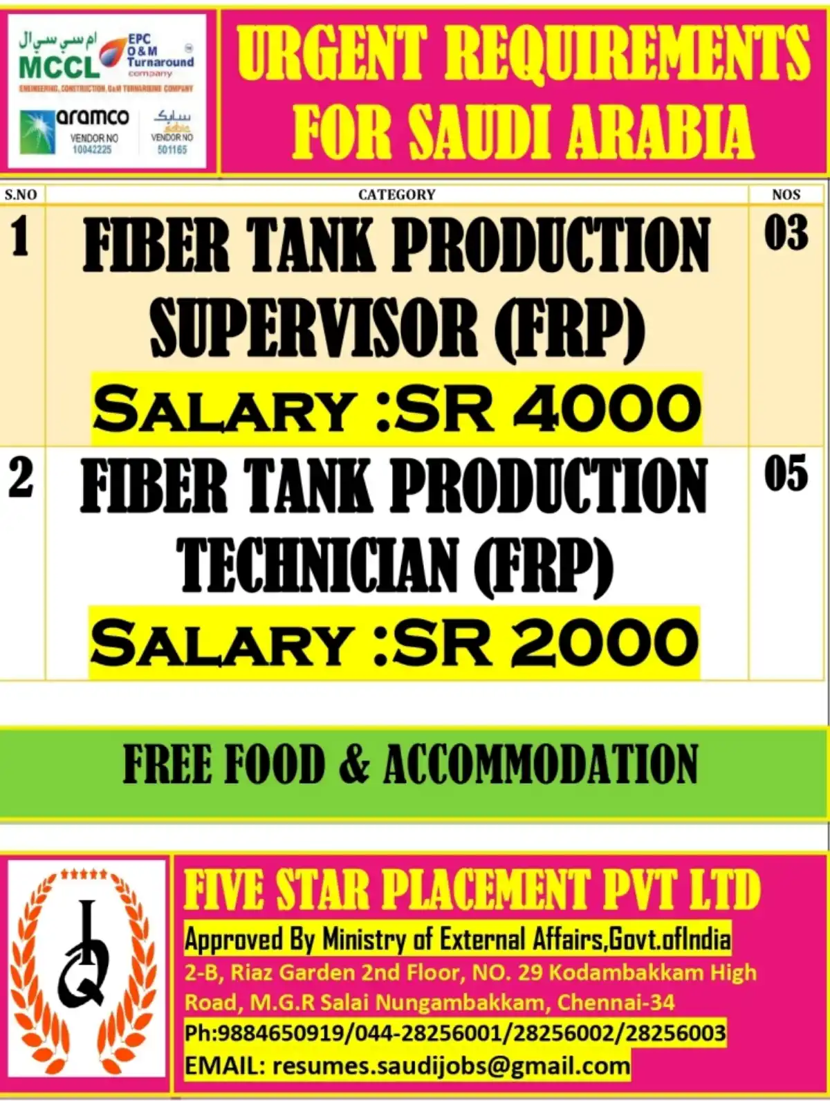 Urgent hiring for FRP Supervisor and Technician in Saudi Arabia. Free food and accommodation provided.