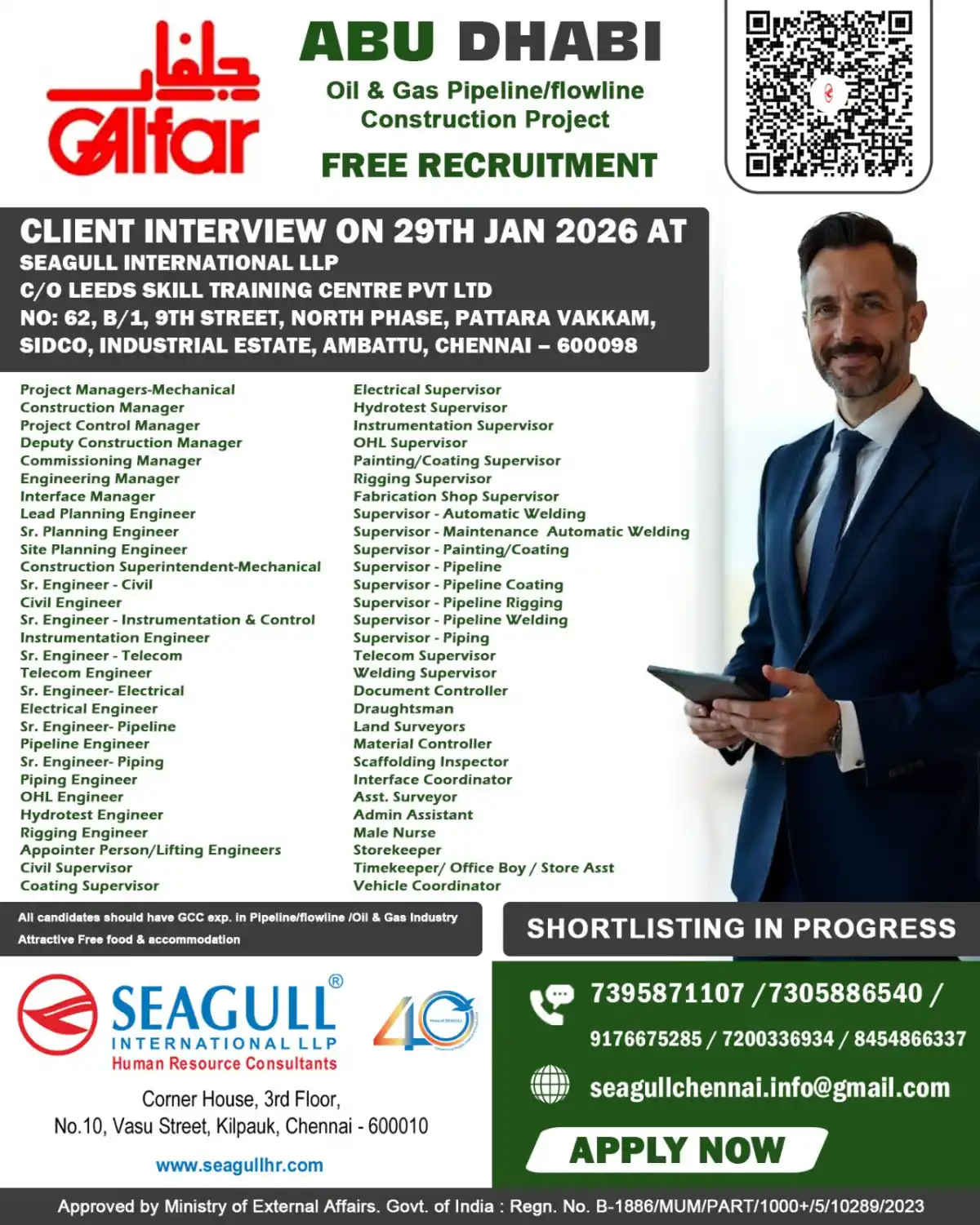 Seagull International LLP hiring for GAlfar’s Abu Dhabi Oil & Gas Pipeline Construction. Client interview on 29th Jan 2026 in Chennai. Multiple positions for experienced candidates with GCC background. Free recruitment with attractive benefits.