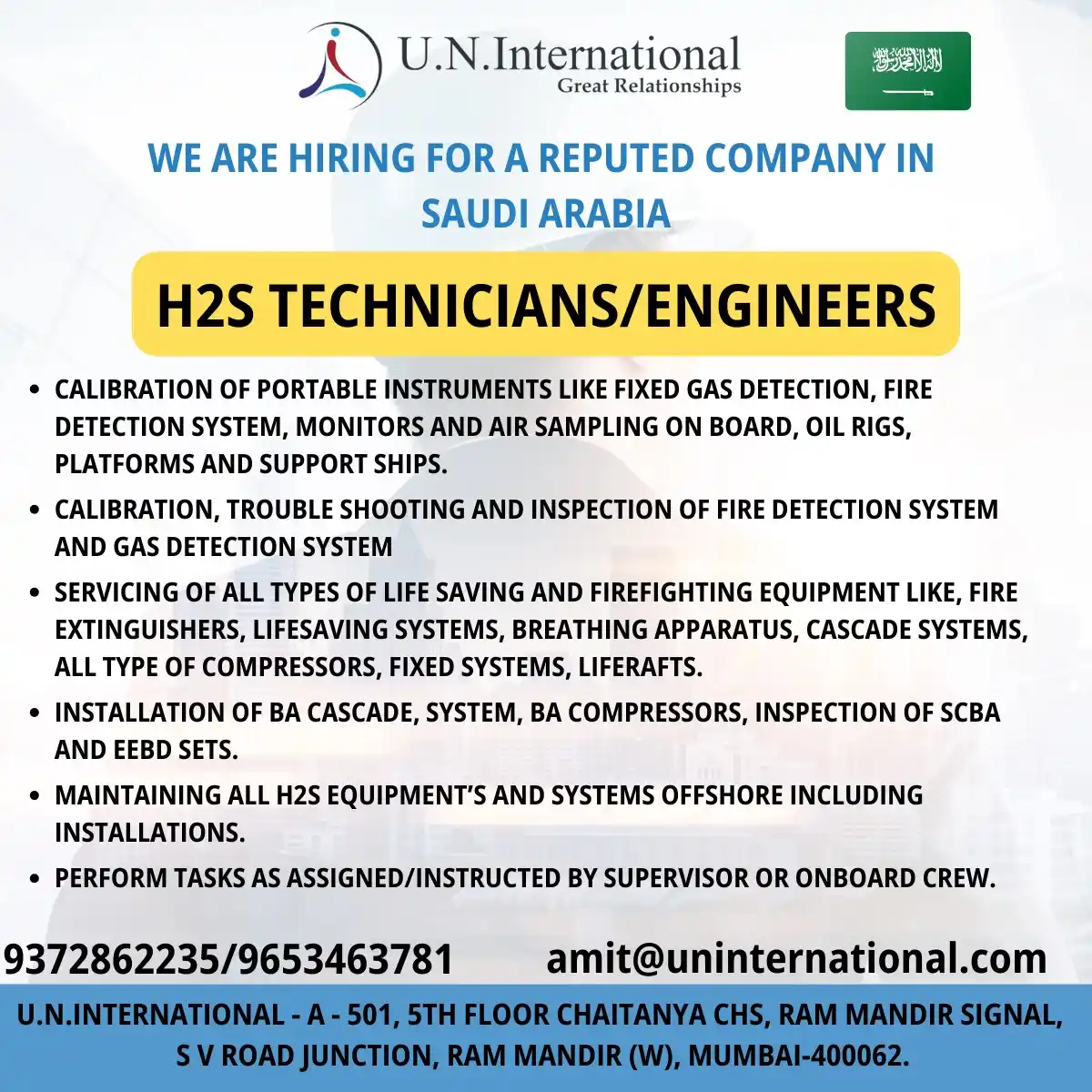 Apply for H2S Technicians and Engineers positions in Saudi Arabia with U.N. International. Roles include equipment calibration and offshore safety system maintenance.