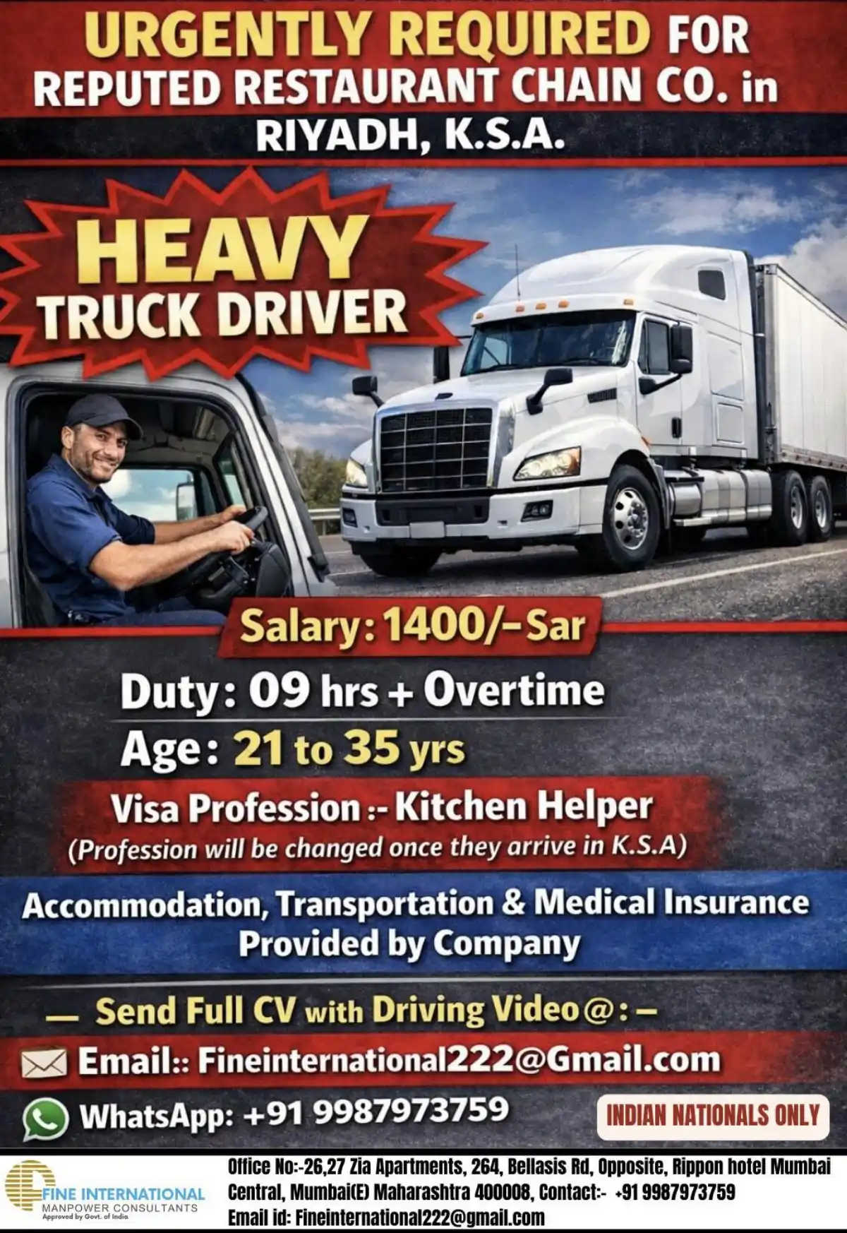 Urgent hiring for Heavy Truck Driver in Riyadh, KSA. Salary 1400 SAR, accommodation, transport, medical insurance. Age 21-35. Apply now.