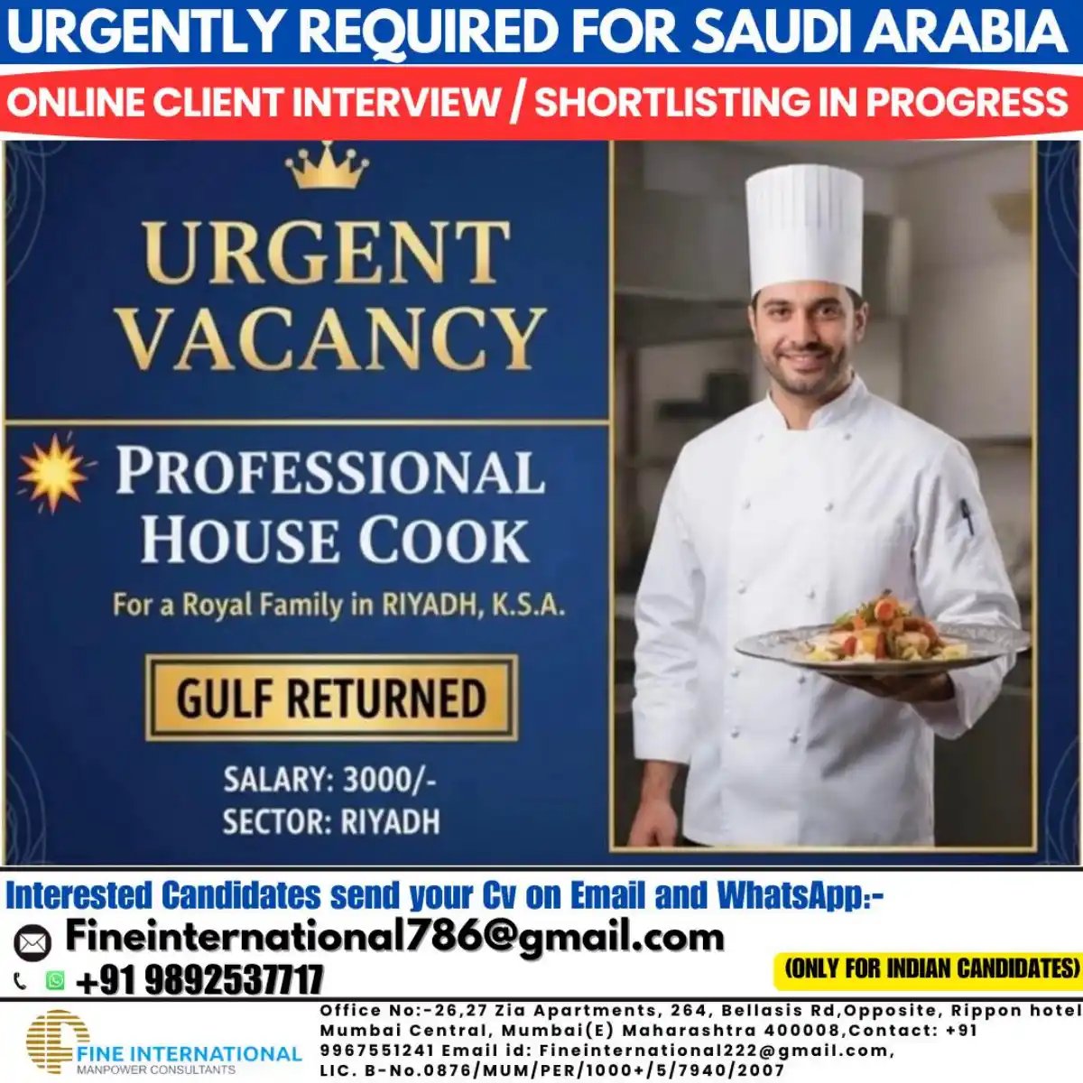 Apply now for an urgent house cook position with a royal family in Riyadh. Salary 3000 SAR. Online interviews.