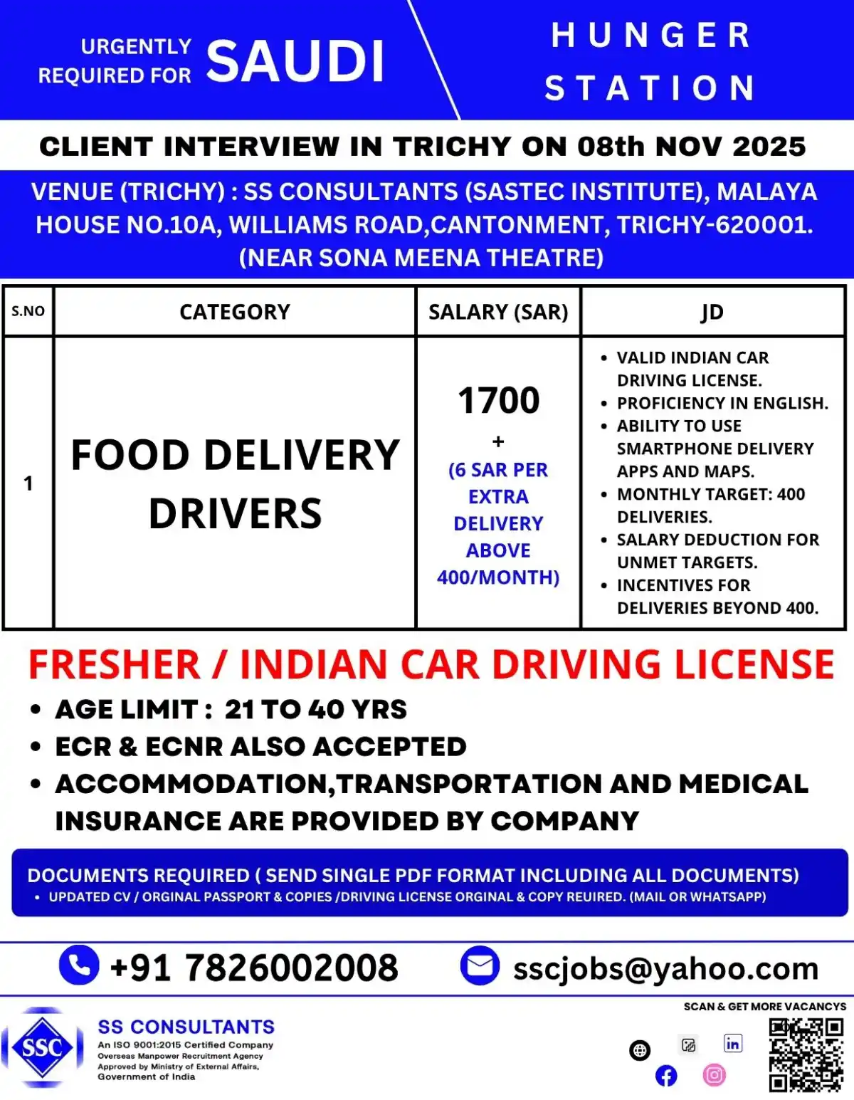 Hiring Food Delivery Drivers for Hunger Station in Saudi Arabia. Interview in Trichy on 08th Nov 2025. Send documents to sscjobs@yahoo.com.