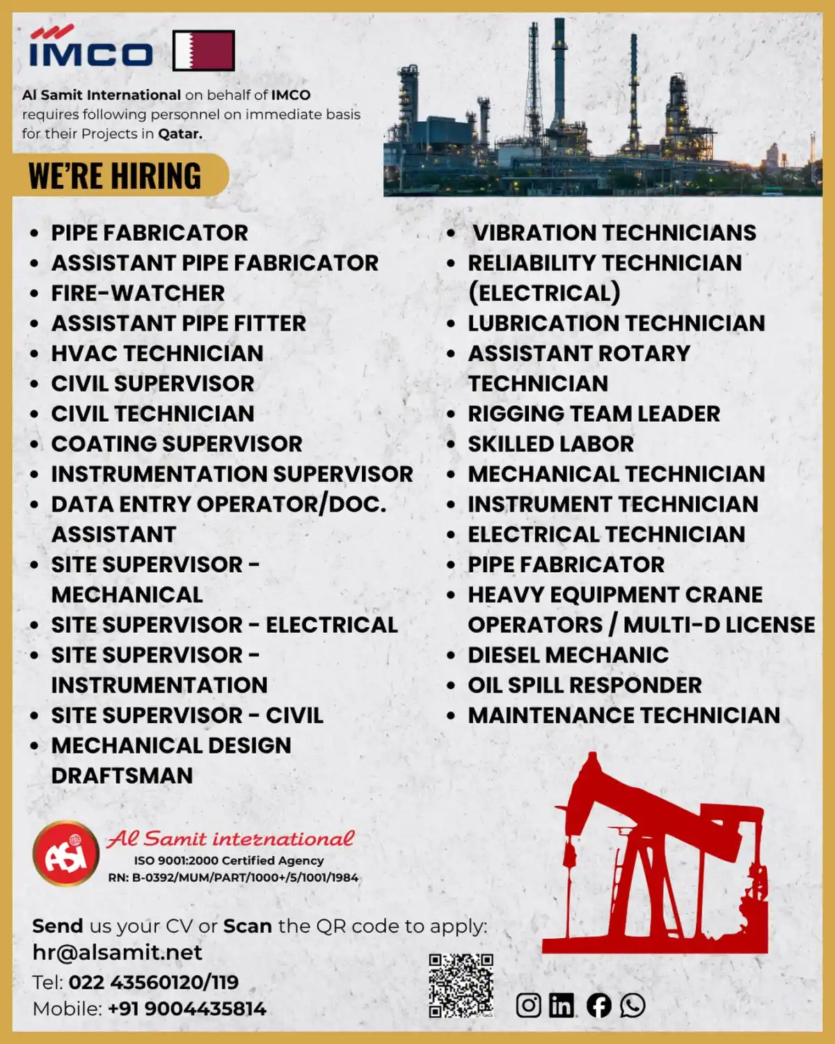 Al Samit International hiring for IMCO Qatar projects: Pipe Fabricators, HVAC Technicians, Civil Supervisors, Electrical Technicians, Instrumentation roles and more. Immediate joining.