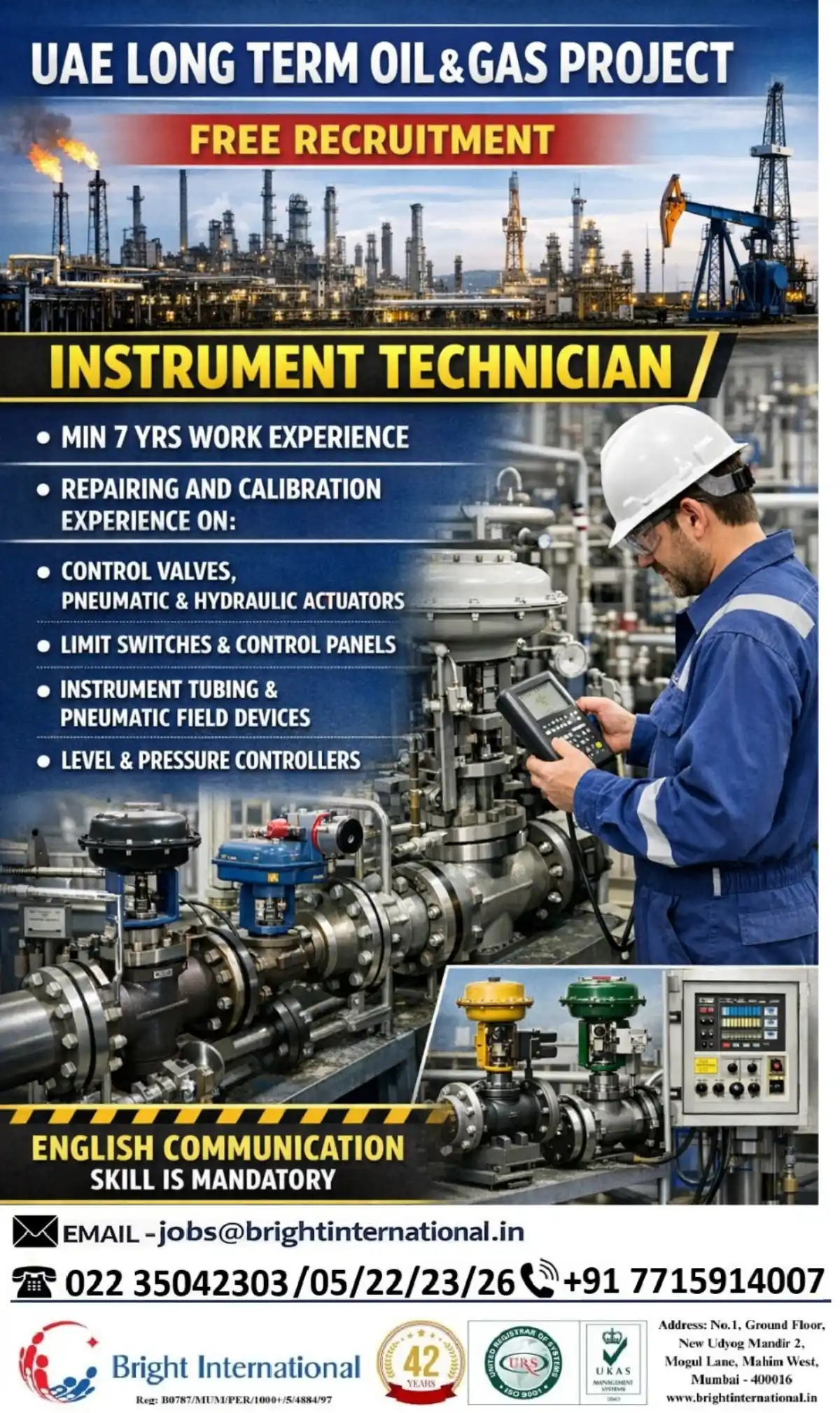 Hiring Instrument Technician for long-term UAE oil & gas project. Free recruitment. 7+ yrs experience required. Apply now!