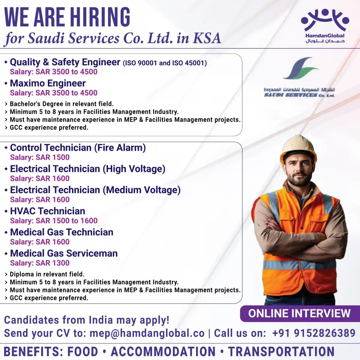HamdanGlobal is recruiting for Saudi Services Co. Ltd. in KSA. Openings for Engineers (SAR 3500-4500) and Technicians (SAR 1300-1600) in Facilities Management. Must have 5-8 years of MEP experience. GCC experience preferred. Benefits: Food, Accommodation, Transportation. Apply now for online interviews.