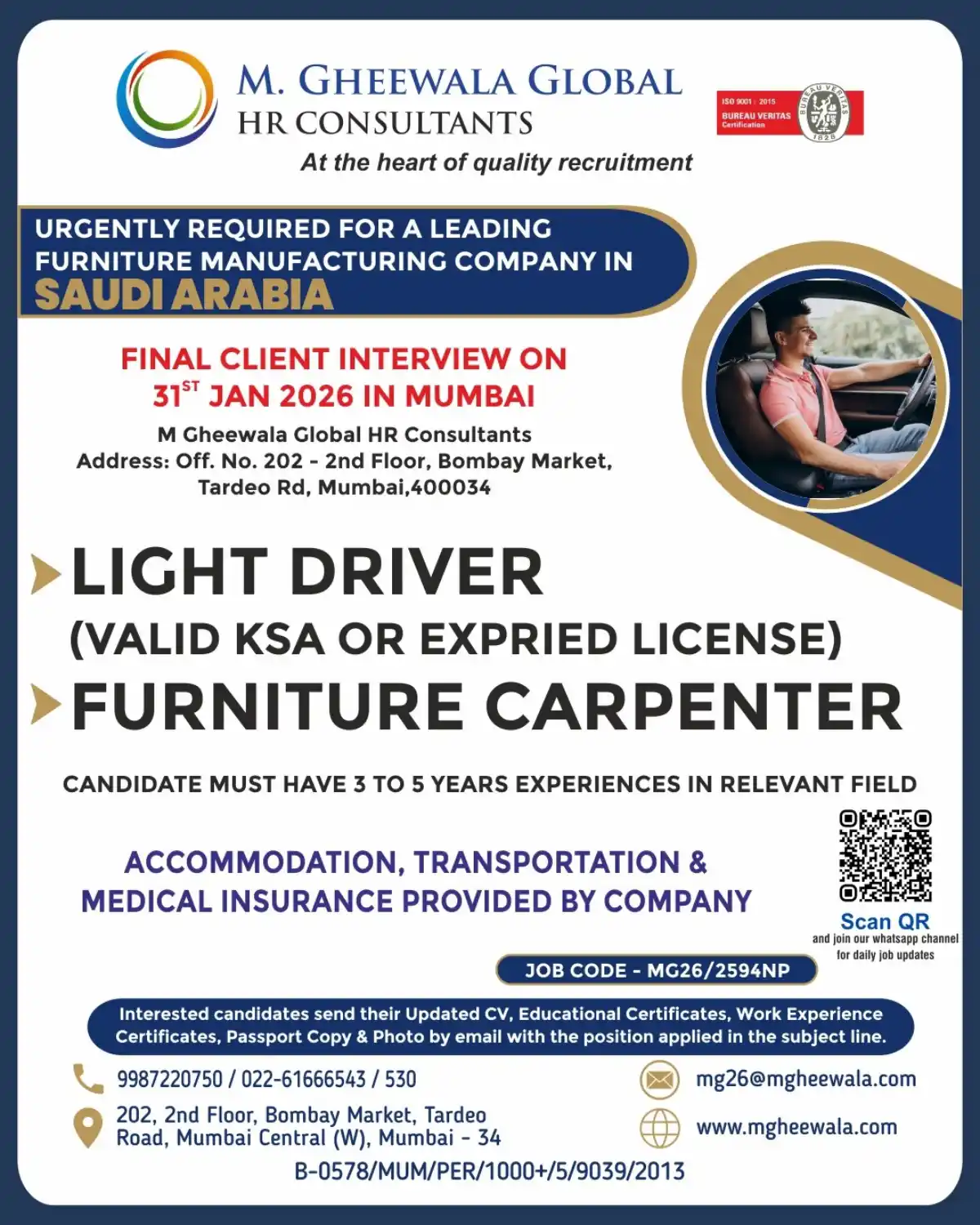 Urgent hiring for Light Driver (KSA license) & Furniture Carpenter (3-5 years exp) for a Saudi furniture company. Interview in Mumbai on 31 Jan 2026.
