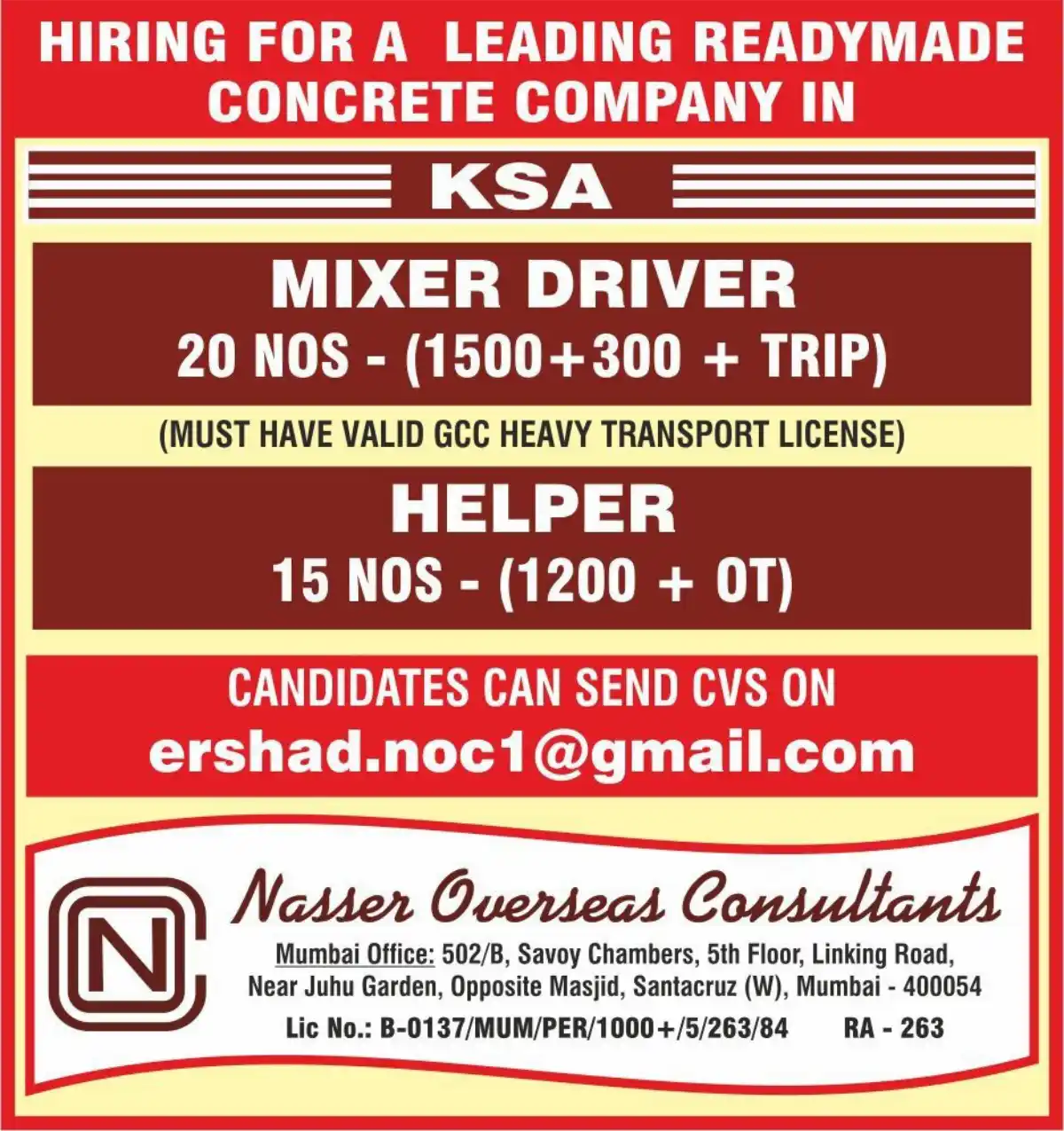 Leading concrete company in Saudi Arabia urgently needs 20 Mixer Drivers (with GCC Heavy License) and 15 Helpers. Competitive pay: 1500+300+Trip for Drivers, 1200+OT for Helpers. Email CV to apply.