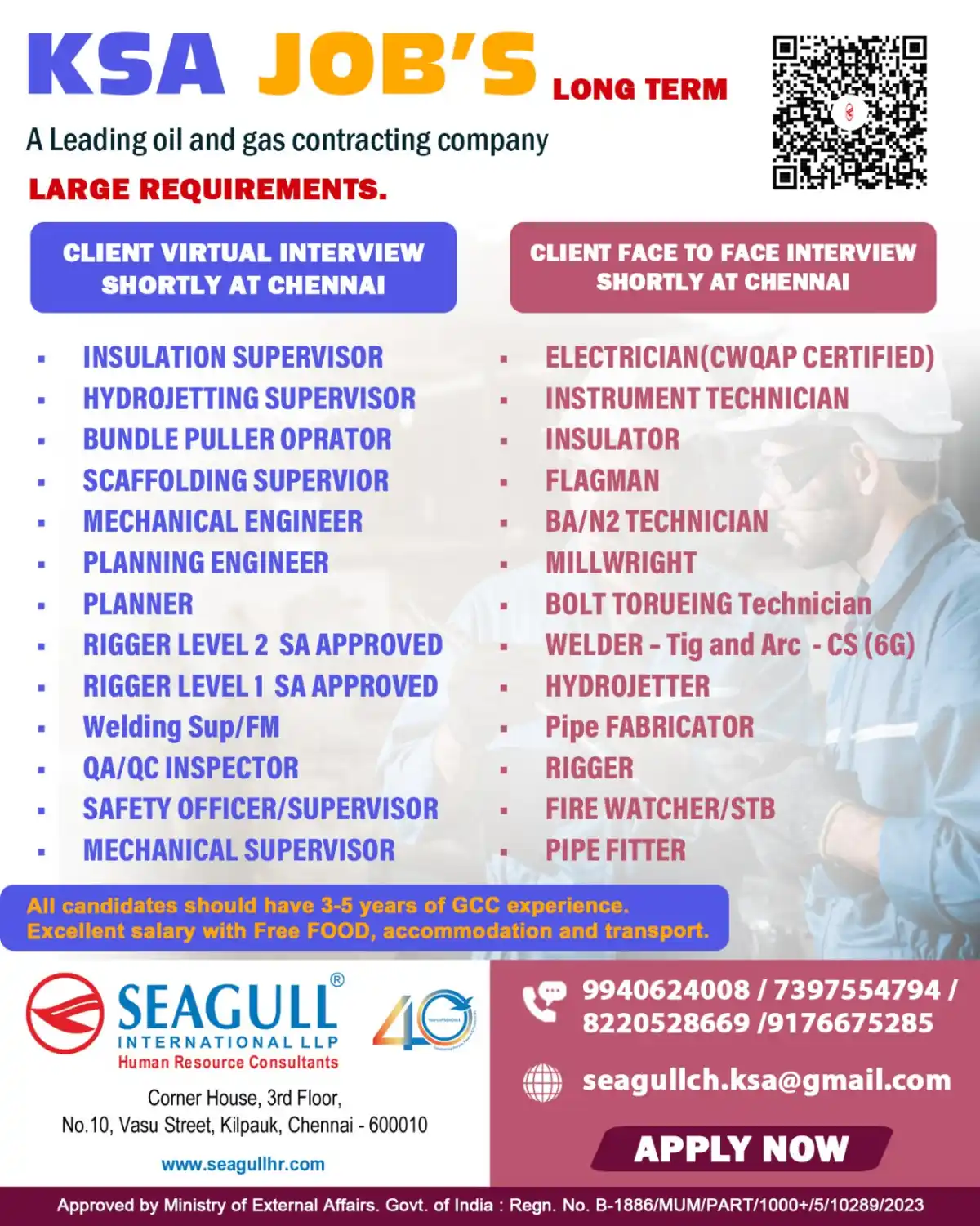 Hiring for various positions in KSA oil and gas industry. Interviews in Chennai. Free food, accommodation, transport.