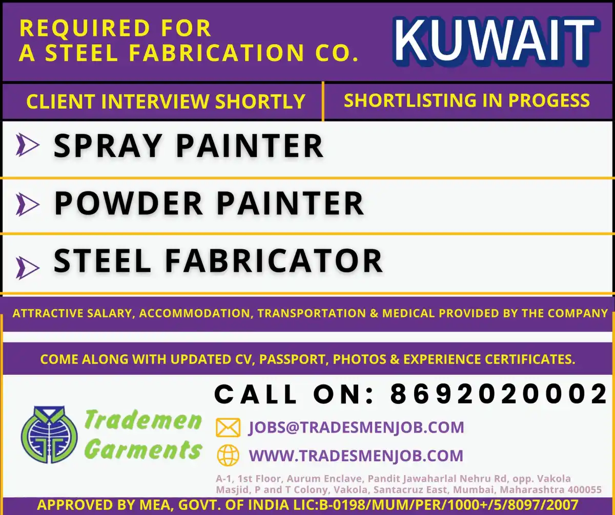 Urgent requirement for Spray Painters, Powder Painters & Steel Fabricators in Kuwait. Excellent salary package with accommodation, transportation & medical benefits. Client interview shortly. Submit your application with updated CV, passport, photos & experience certificates.