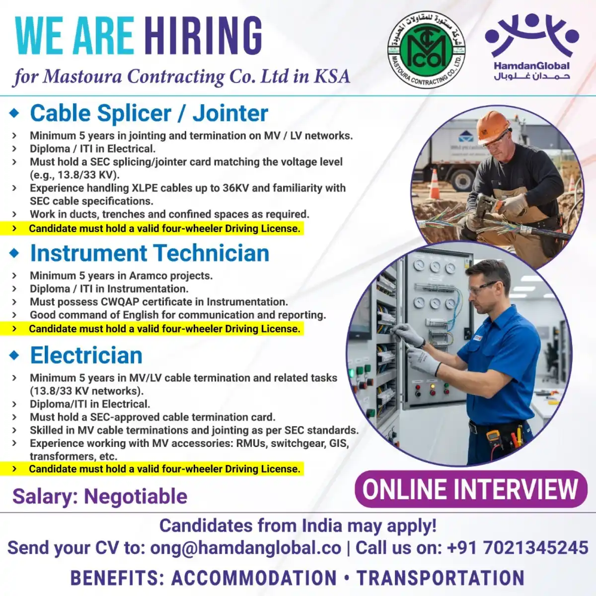 Mastoura Contracting Co. Ltd in Saudi Arabia is hiring experienced professionals for Cable Splicer/Jointer, Instrument Technician, and Electrician roles. Minimum 5 years experience and relevant certifications required. Attractive benefits. Online interviews. Apply now!