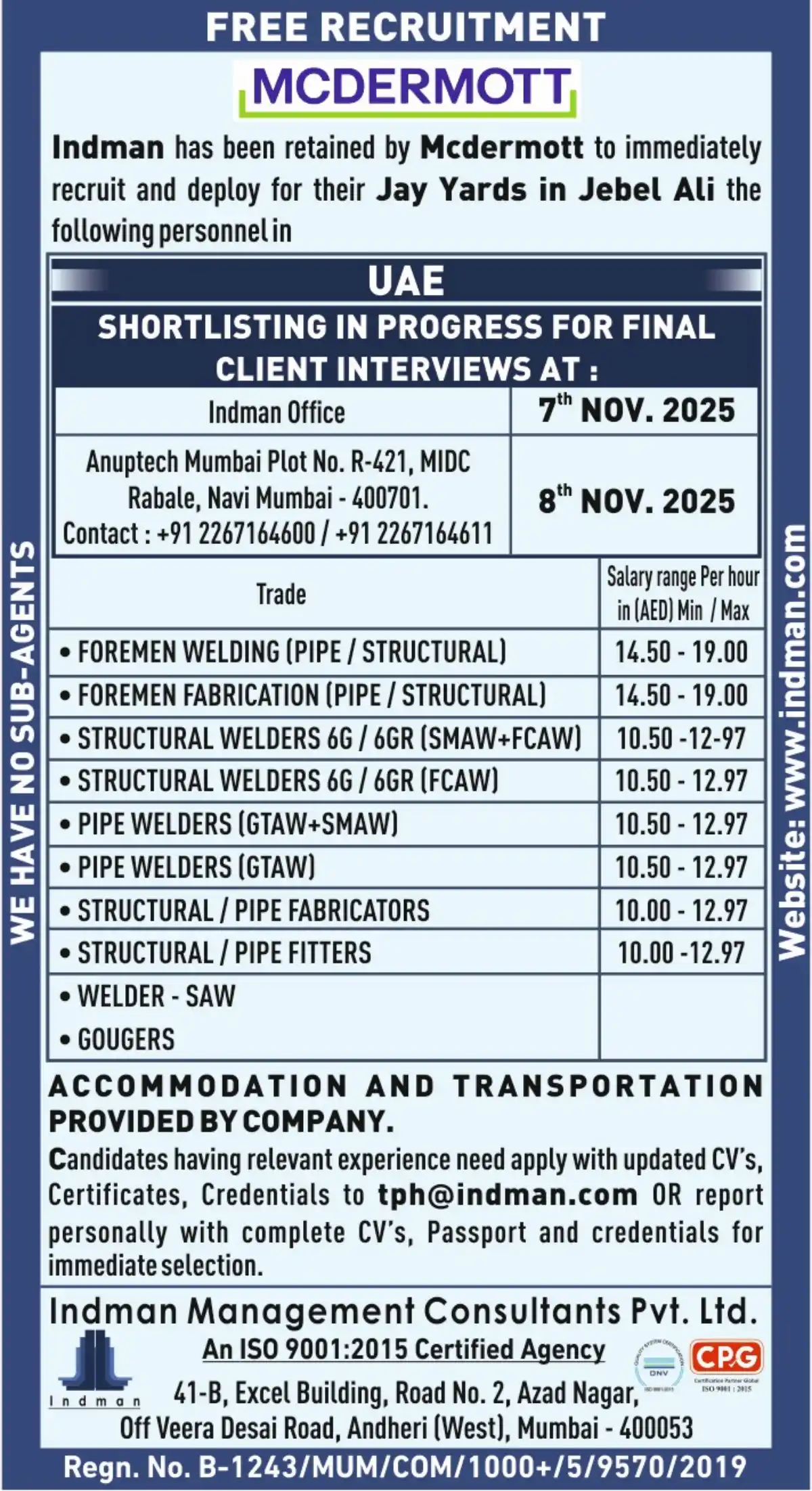 Hiring for welding, fabrication, and fitting roles in Jebel Ali. Accommodation and transport provided. Interviews on 7th & 8th Nov 2025.