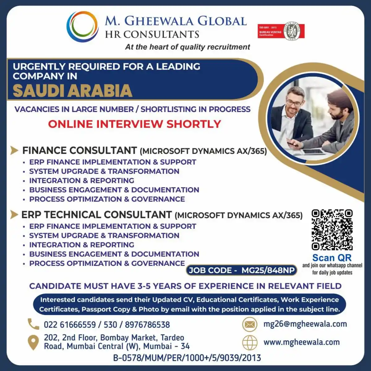 Urgent hiring for Finance & ERP Technical Consultants with 3-5 years MS Dynamics AX/365 experience. Saudi Arabia placement. Online interviews.
