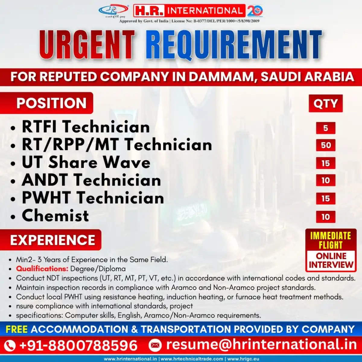 Urgent hiring for NDT Technicians in Dammam, Saudi Arabia. 100+ vacancies available immediately. Free accommodation & transportation. Online interview process. Apply now for immediate deployment.