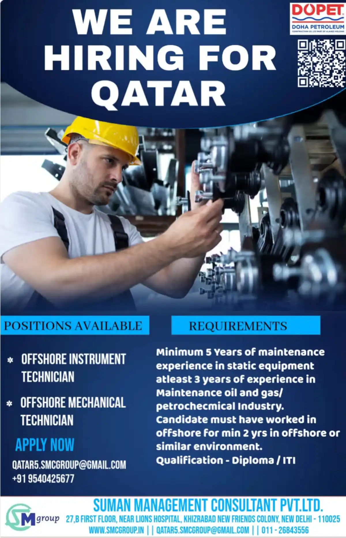 Immediate openings for offshore instrument and mechanical technicians at Doha Petroleum, Qatar. Minimum 5 years experience required. Apply today!