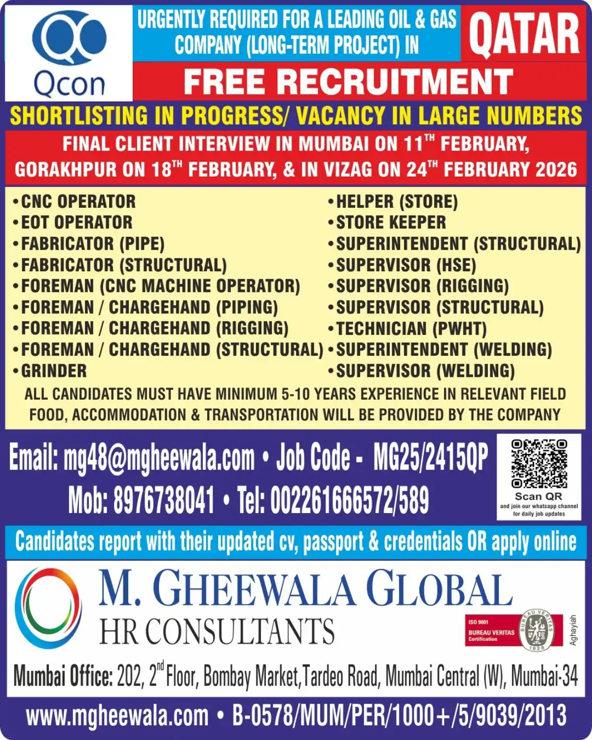 Hiring for multiple positions in Qatar’s oil and gas sector. 5-10 years experience needed. Interviews in Mumbai, Gorakhpur, Vizag. Free recruitment with benefits.