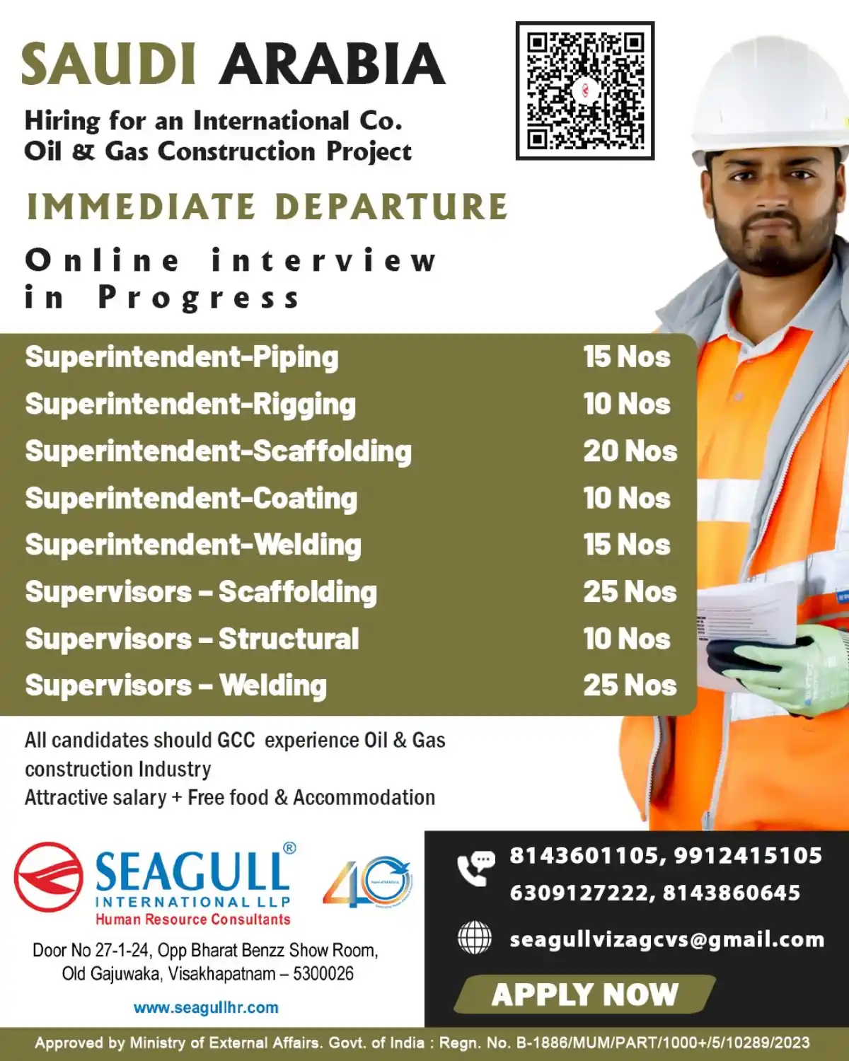 Urgent hiring for Oil & Gas Construction Project in Saudi Arabia. Multiple Superintendent and Supervisor positions available with attractive salary, free food & accommodation. Online interviews ongoing.