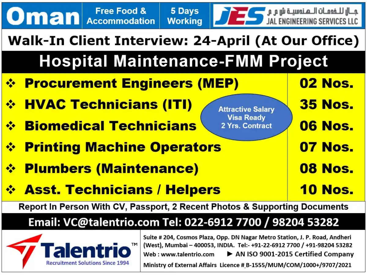 Multiple engineering positions available in Oman with free food & accommodation. Walk-in interview on 24th April in Mumbai. HVAC, Biomedical, Procurement Engineers & more needed.