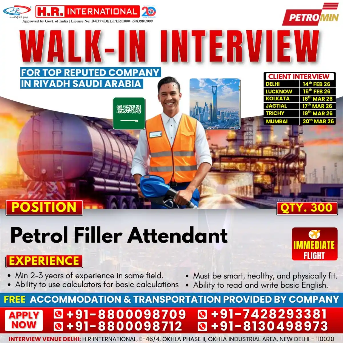 Immediate hiring for 300 Petrol Filler Attendants in Riyadh. Walk-in interviews in Delhi, Lucknow, Kolkata, Jagitial, Mumbai. Free accommodation & flight provided.