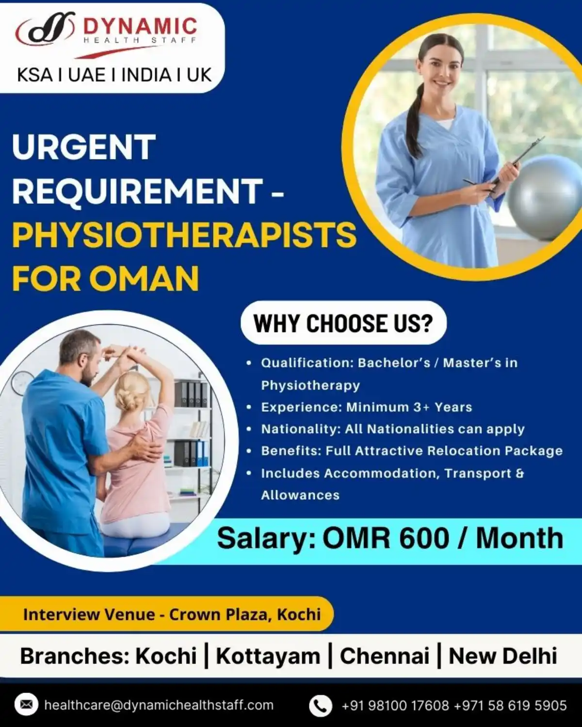 Apply now for physiotherapist positions in Oman. Minimum 3 years experience required. Salary OMR 600/month with relocation benefits.