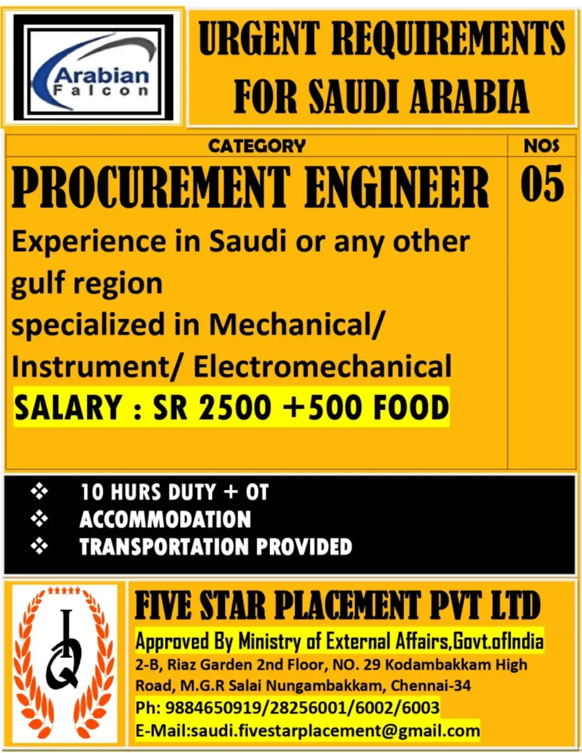 Urgent hiring for 5 Procurement Engineer positions in Saudi Arabia. Experience in Gulf required. Apply now!
