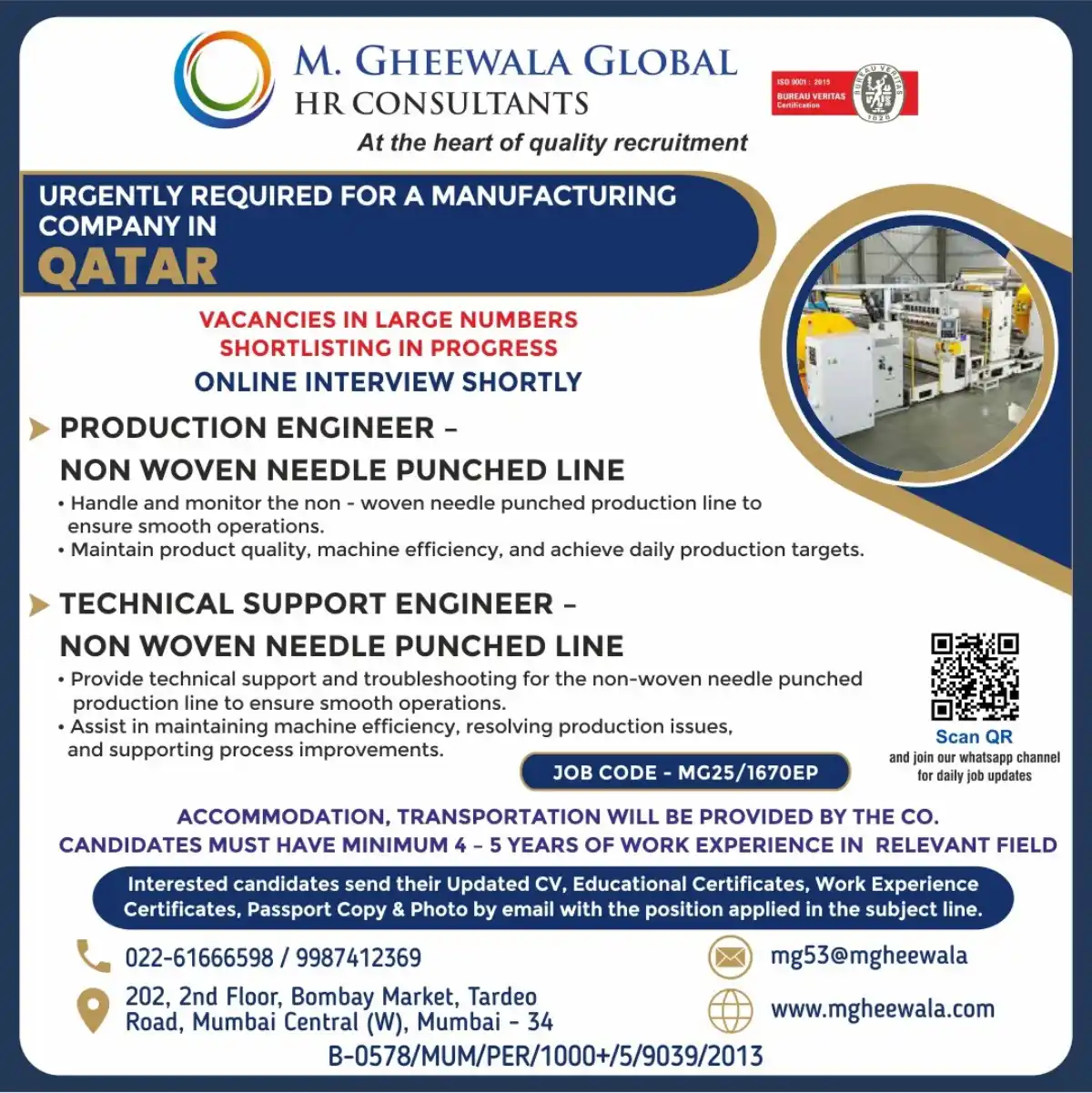 Hiring Production and Technical Support Engineers for non-woven needle punched line in Qatar. 4-5 years experience needed. Accommodation and transport included. Apply now!