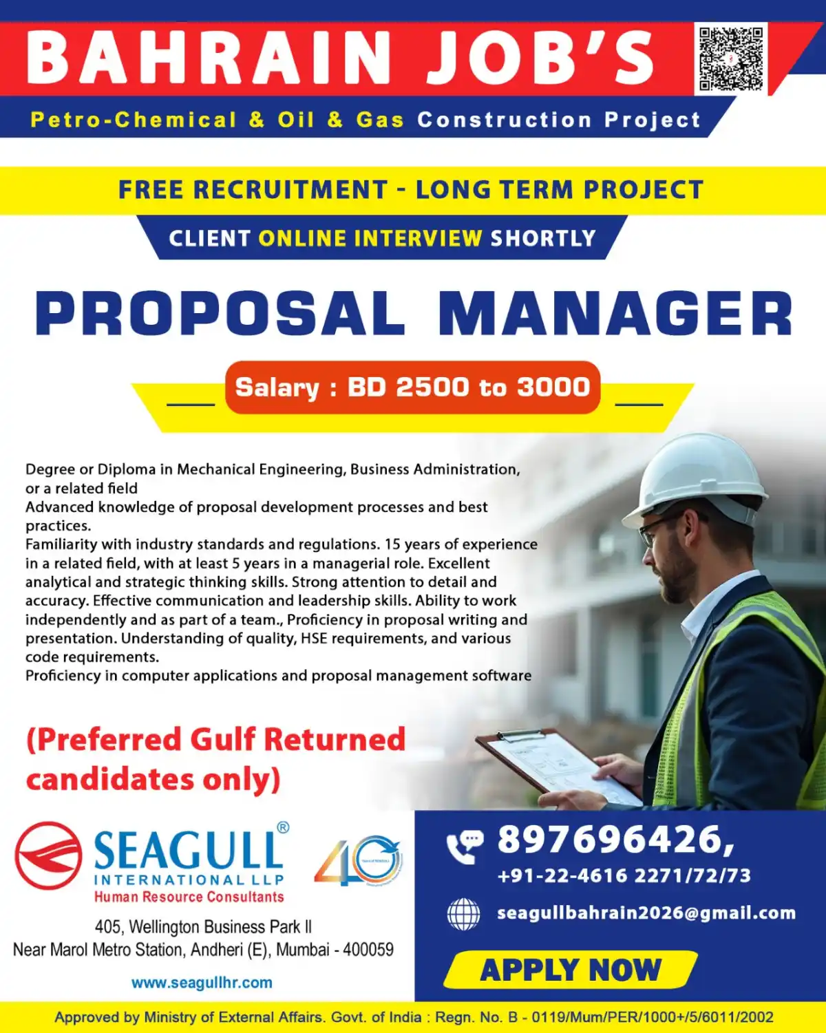 Hiring Proposal Manager for Bahrain petro-chemical project. Salary BD 2500-3000. 15+ years experience required. Free recruitment. Online interview shortly.