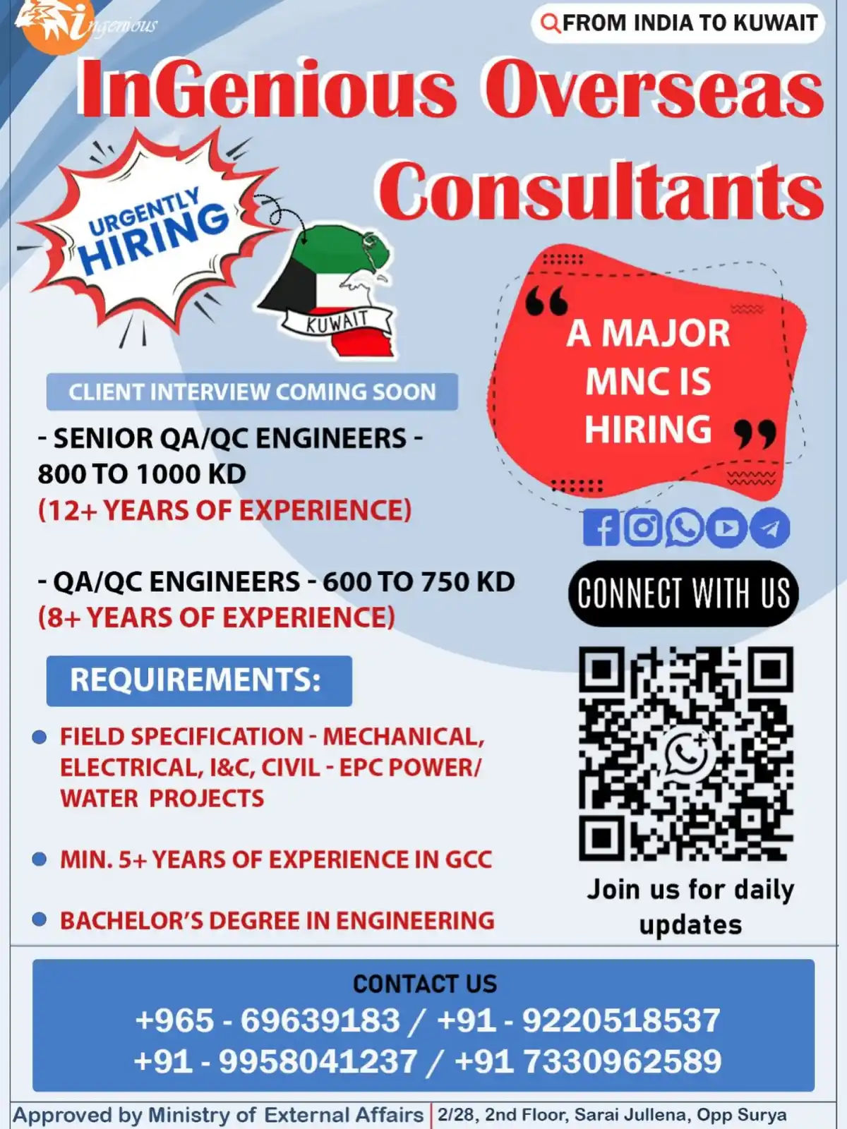 Urgent hiring for QA/QC Engineers in Kuwait. Salary up to 1000 KD. 5+ years GCC experience required. Client interview coming soon. Contact InGenious Overseas to apply.