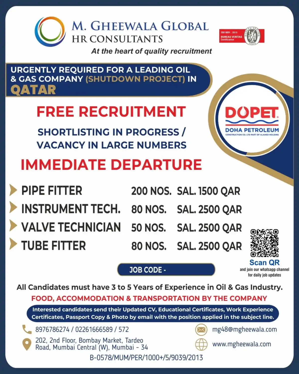 Urgent hiring for Qatar shutdown project: 200 Pipe Fitters, 80 Instrument Techs, 50 Valve Techs, 80 Tube Fitters. Salary 1500-2500 QAR. Free accommodation, food, transport. 3-5 years Oil & Gas exp required. Apply now!
